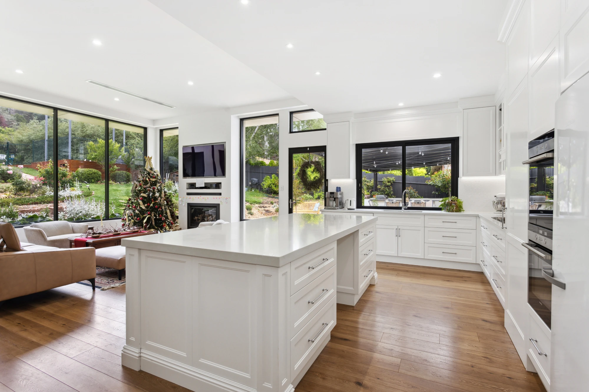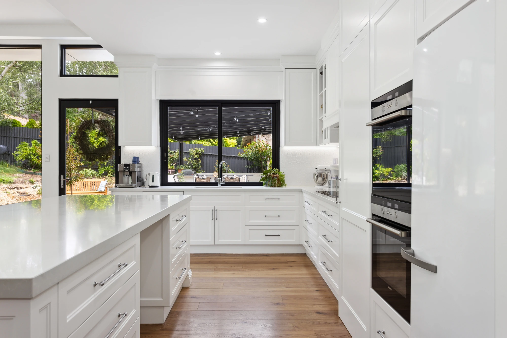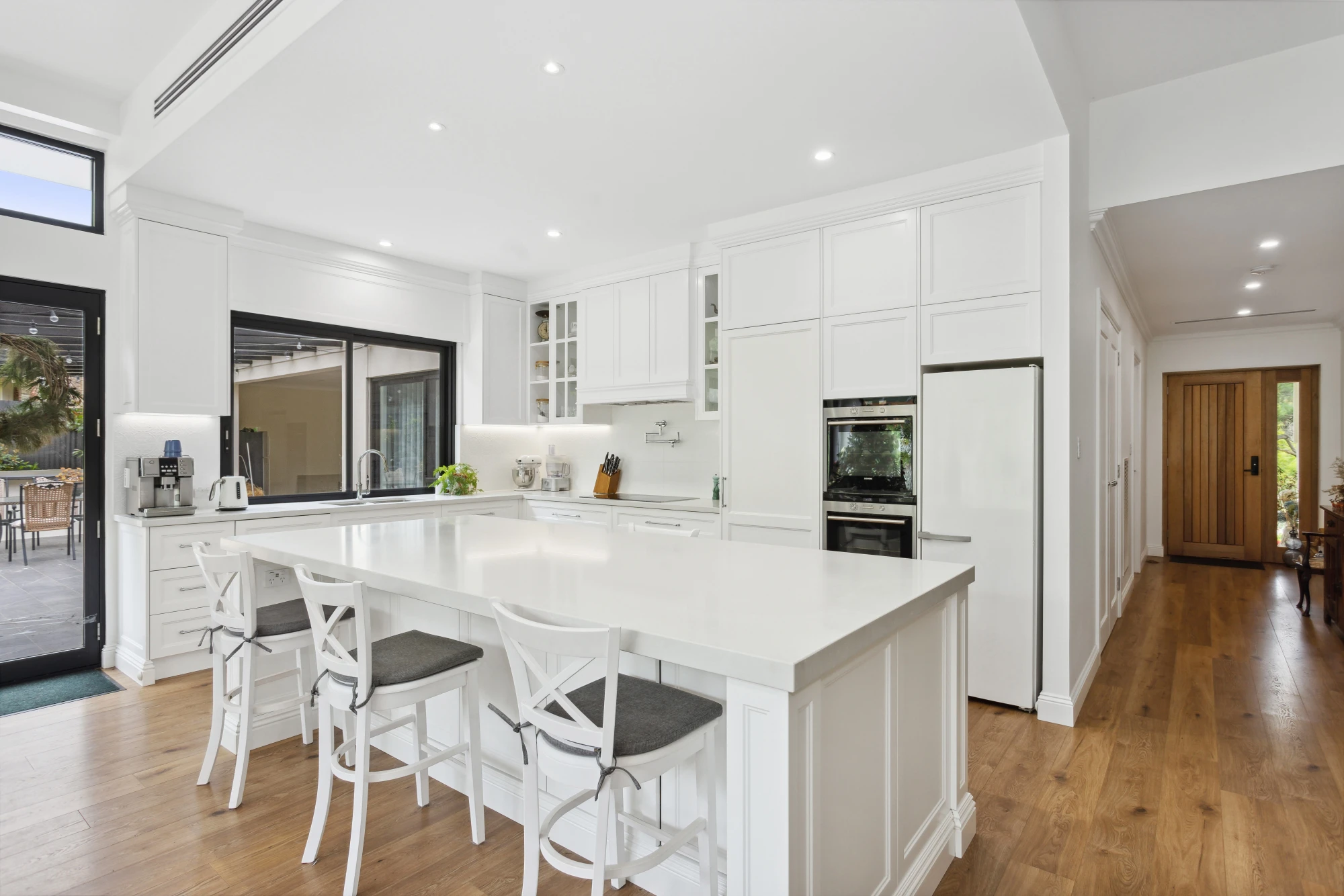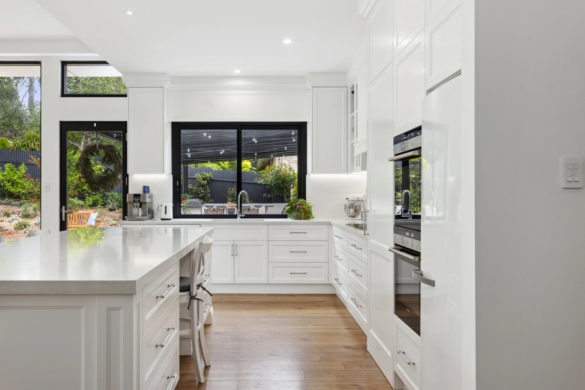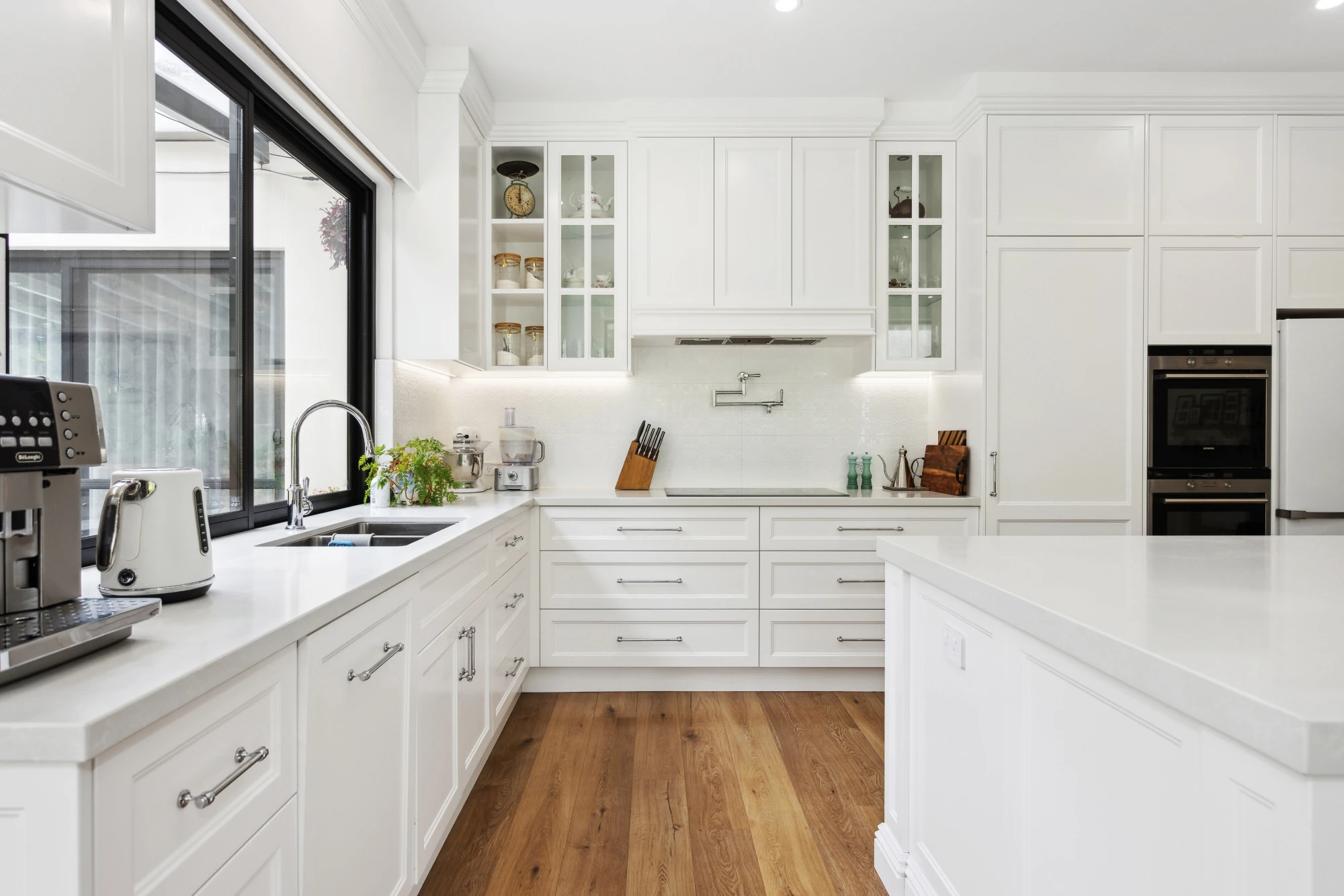 Featuring Veronica doors and feature posts in 2 pack paint by Davis and Park, exclusive Davis and Park Tilley mantle, a lovely pelmet over the window, tying the kitchen together, a sitting nook on the working side of the kitchen island, so that you can relax with your guests, and a walk in pantry concealed behind the door adjacent the oven.
