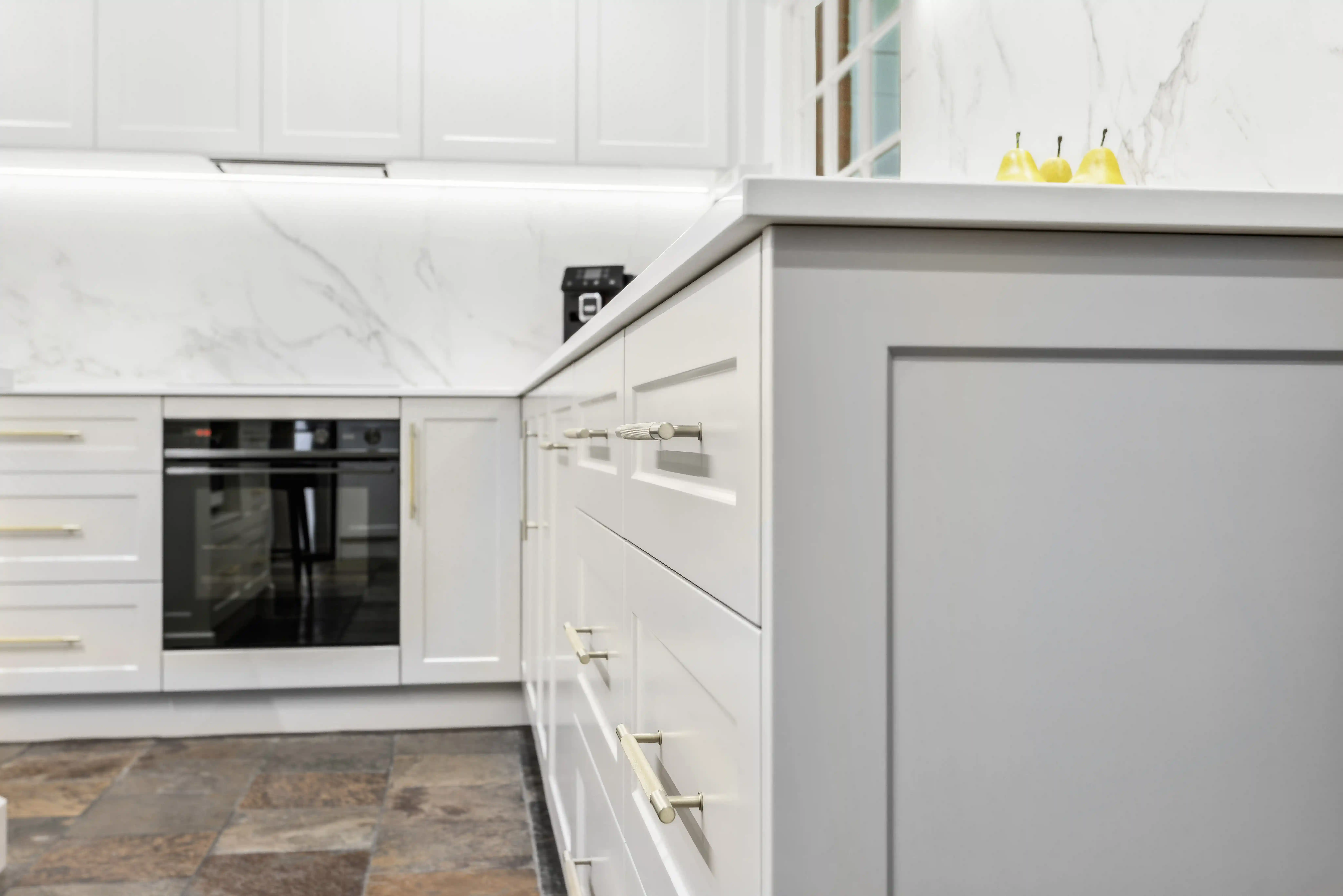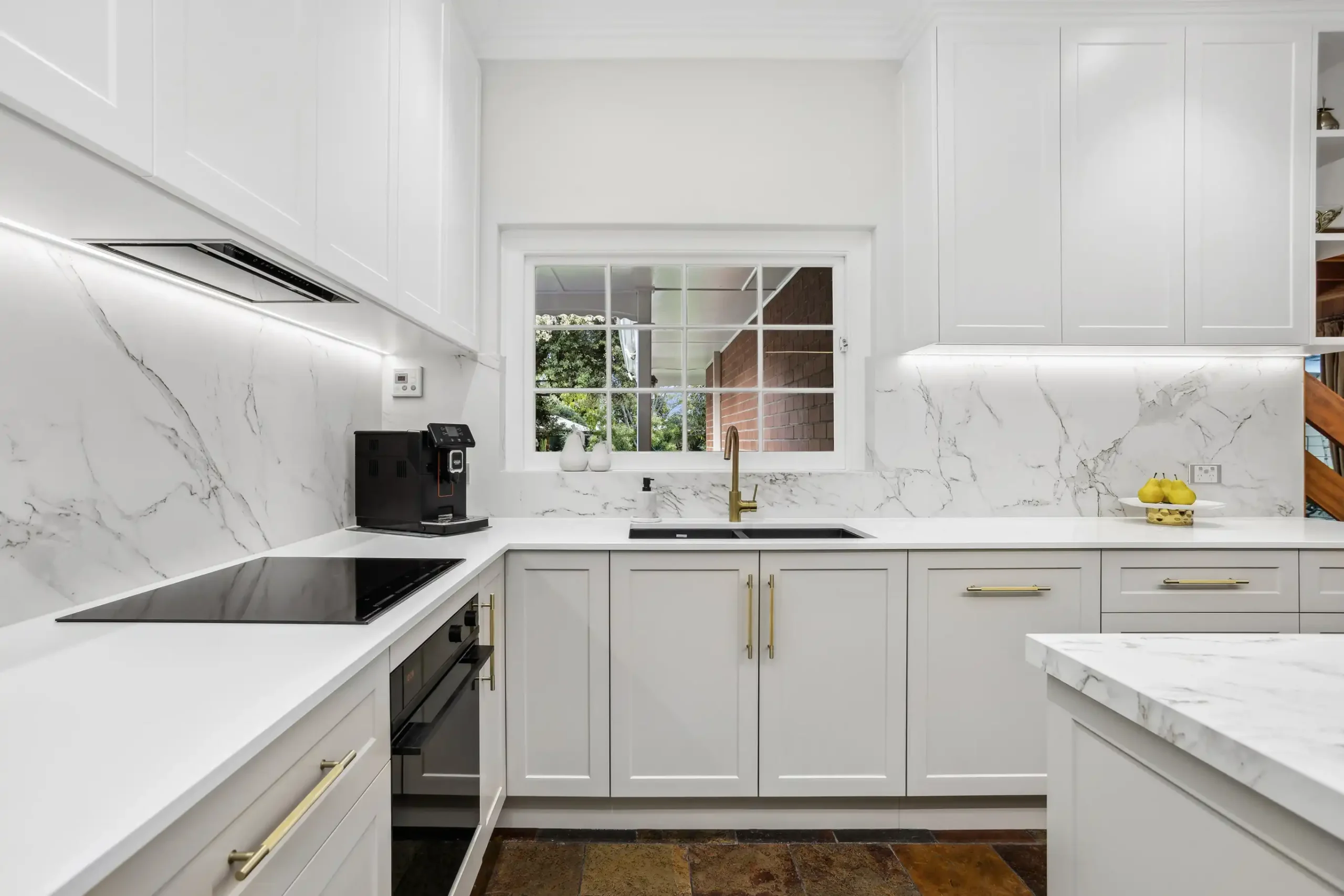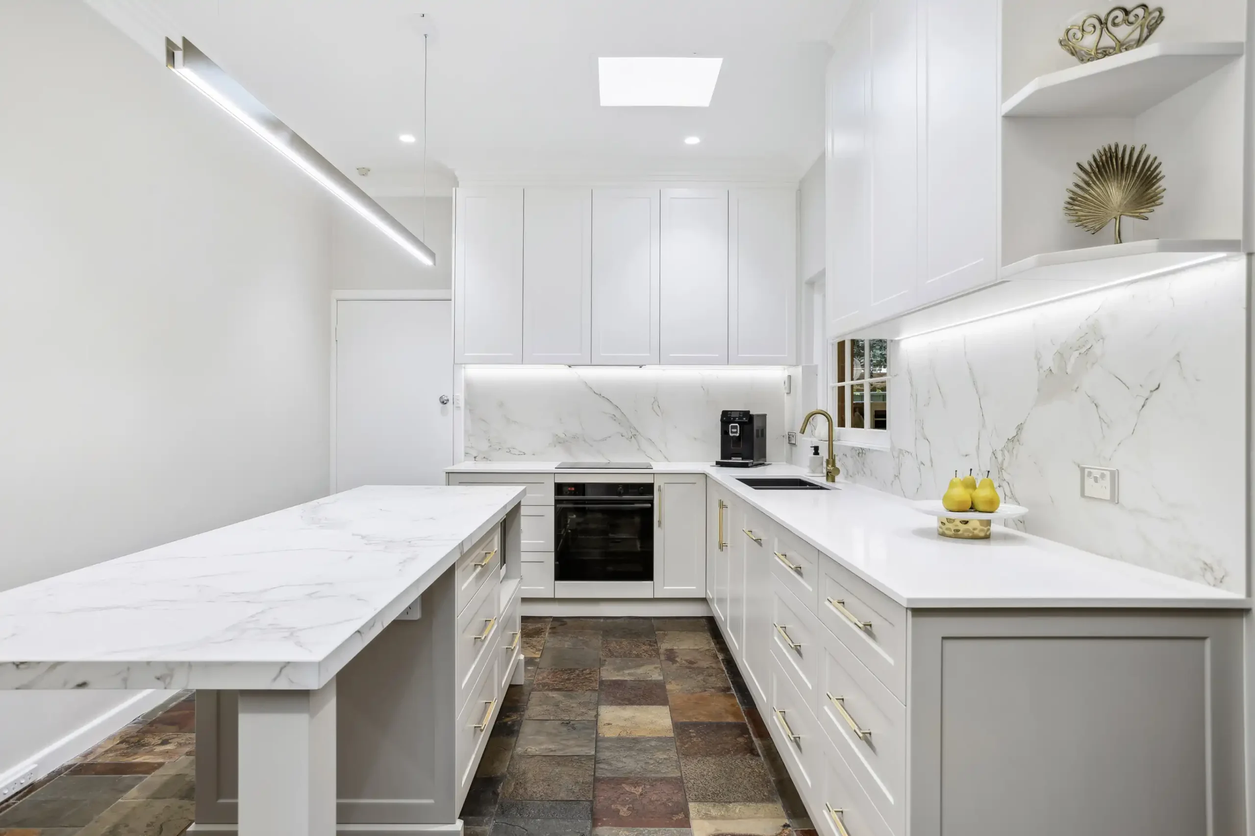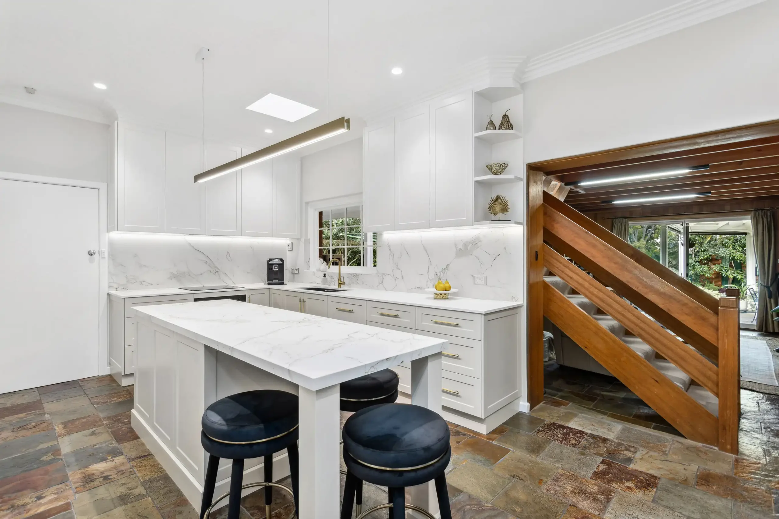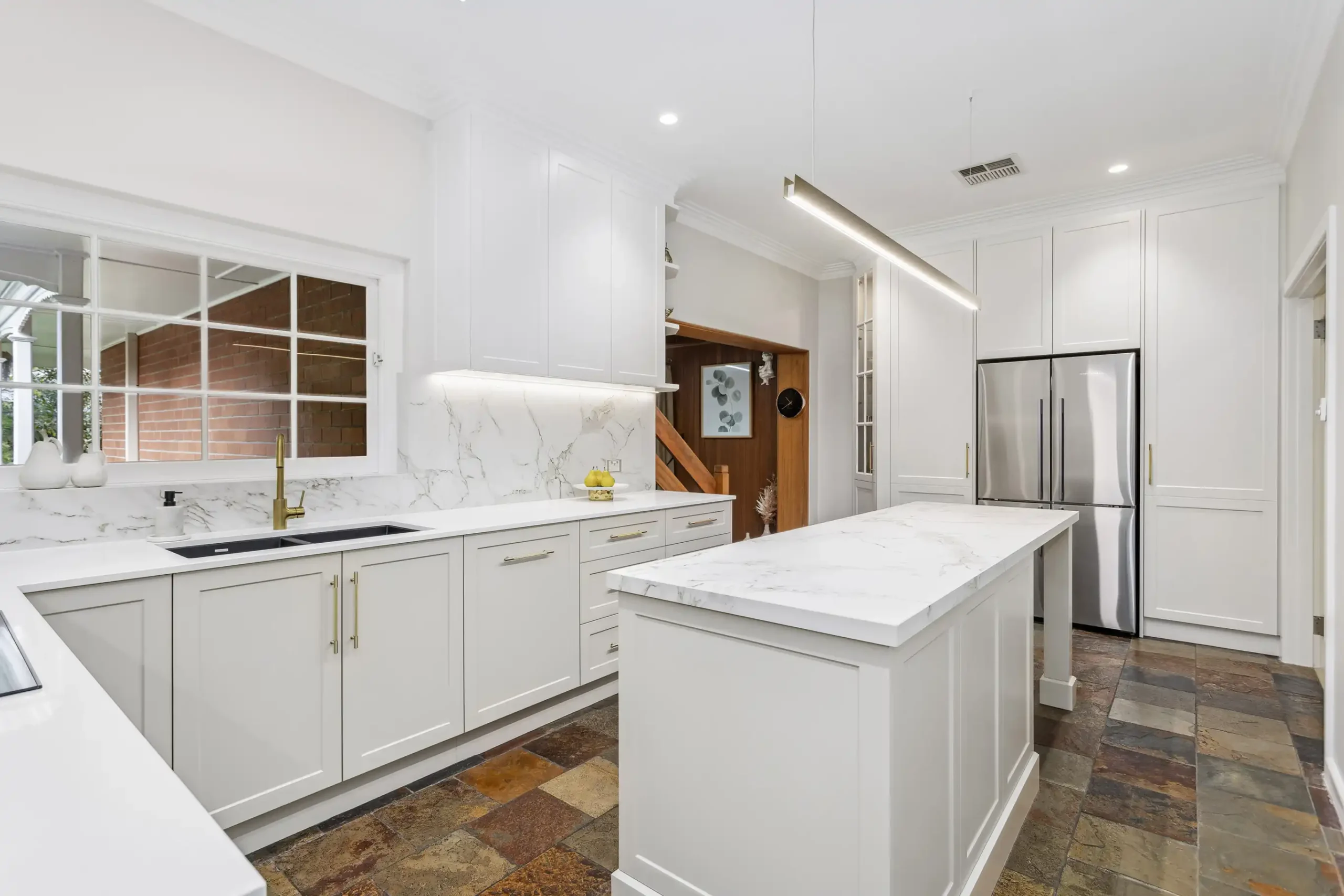 This stunning Kitchen also displays two benchtop surfaces. Creating a feature of the Island bench and also utilising this material as the splashback, to bring a cohesive look without being too overbearing on all benchtop surfaces.