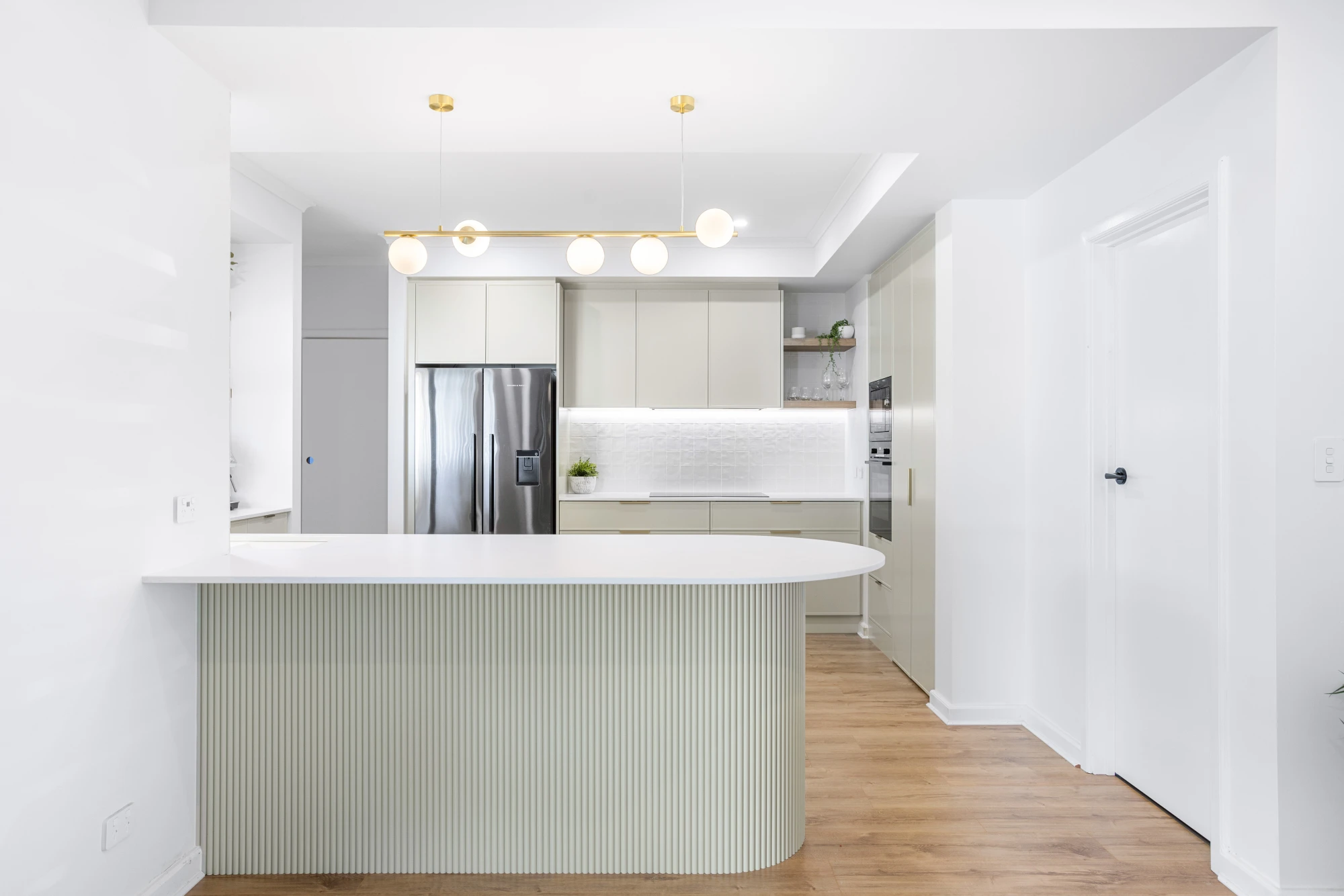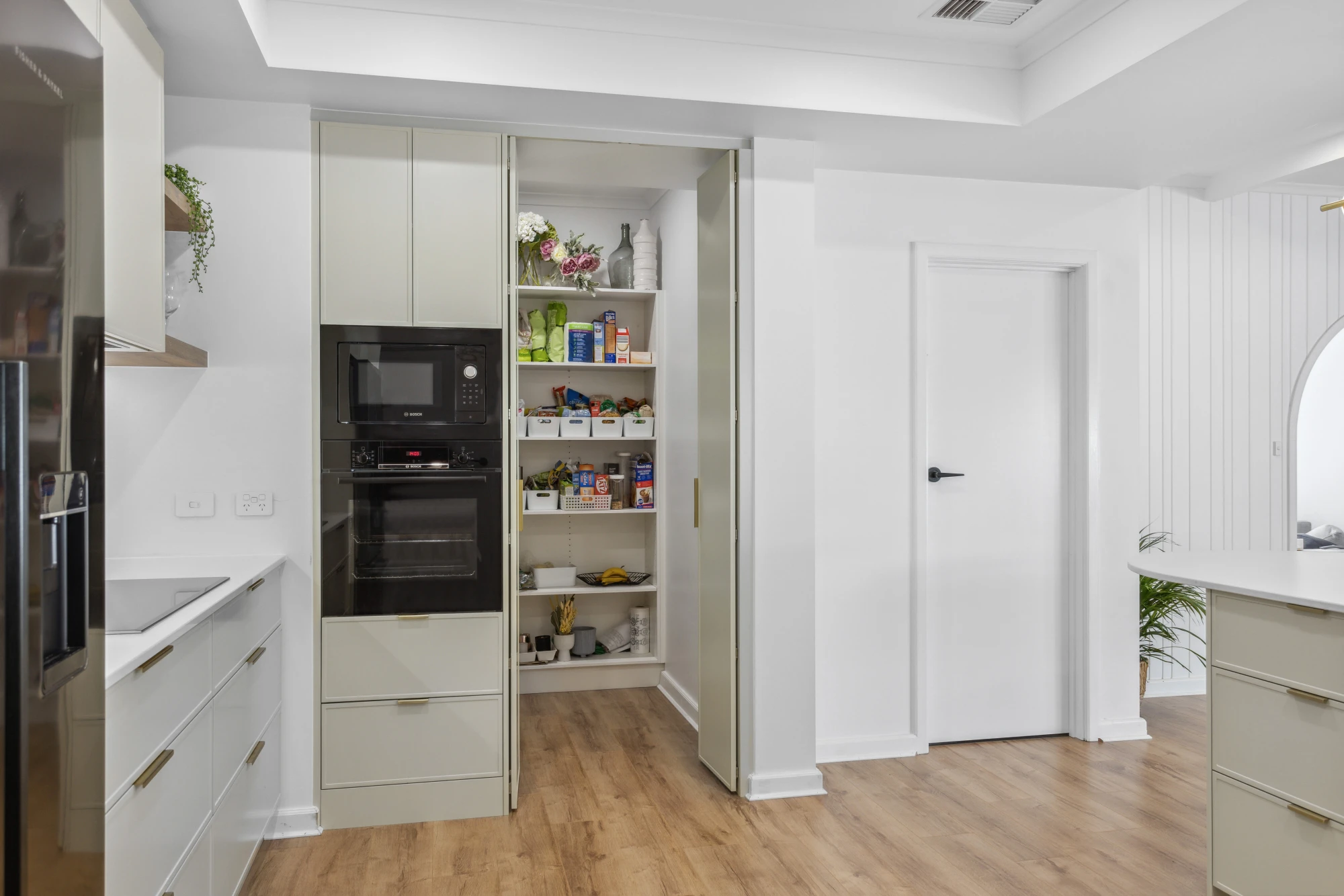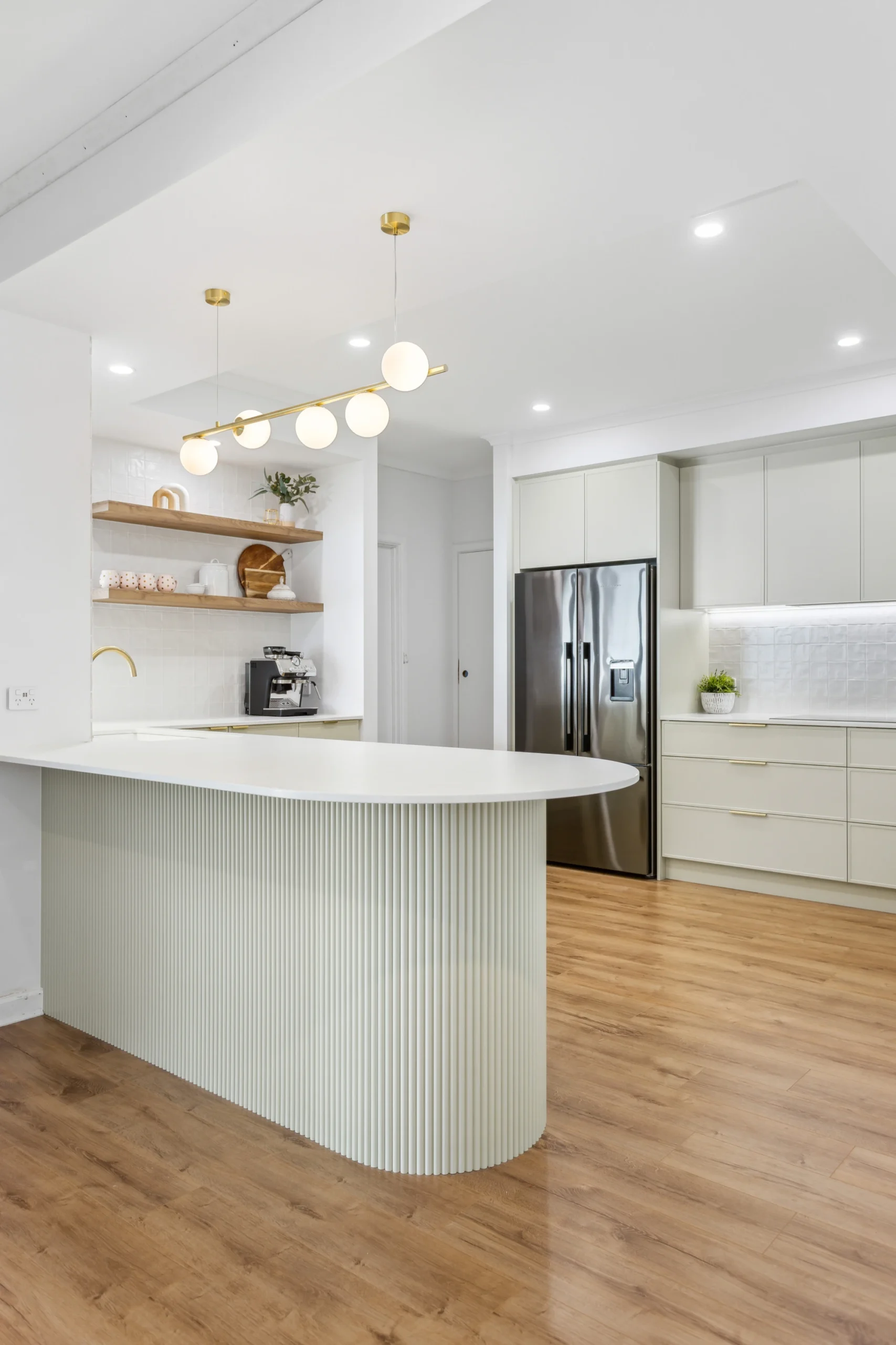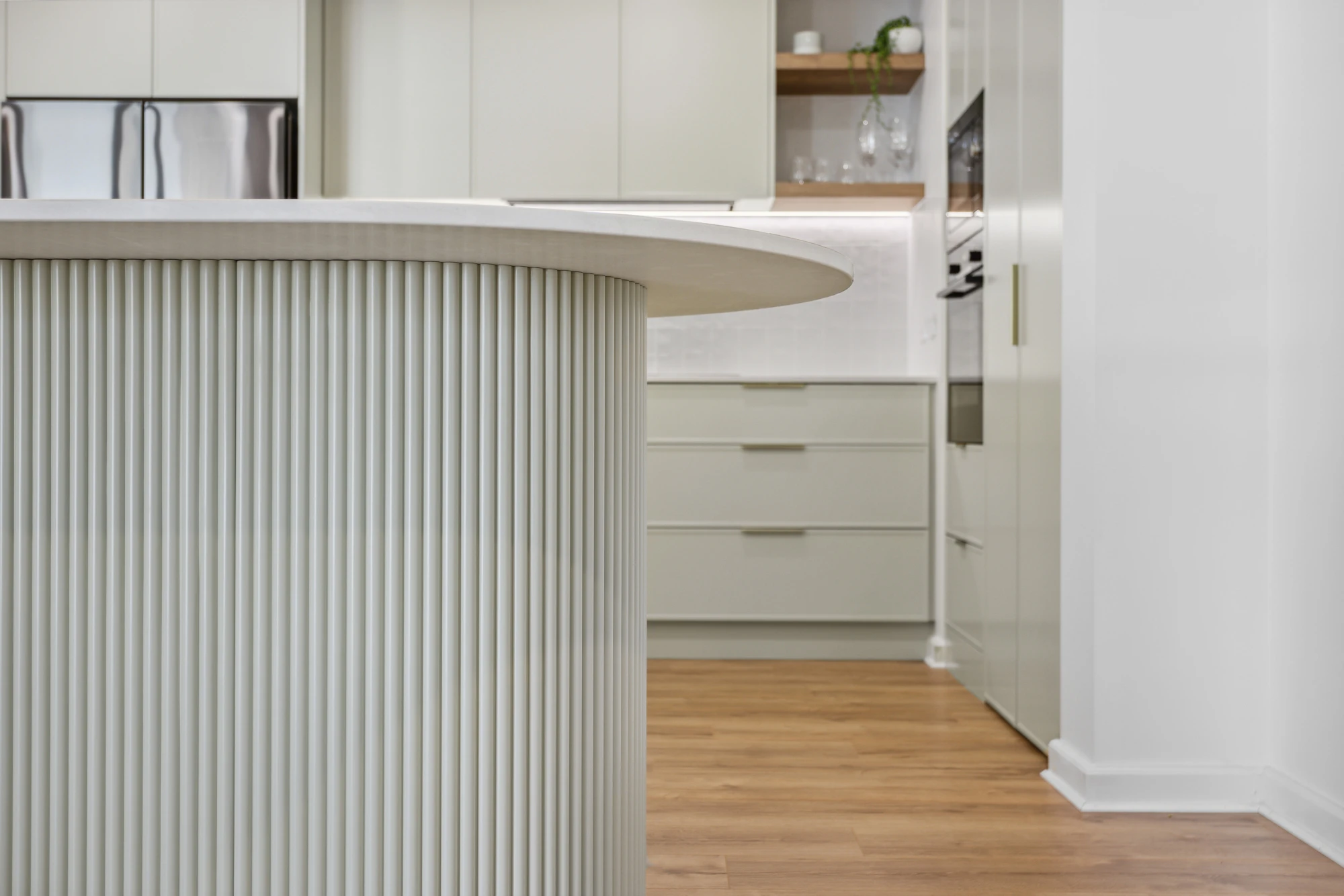 This kitchen, with hidden pantry, features the Davis and Park ‘Hudson’ profile doors painted in Olivette with a curved stone bench top and feature curved servery bar back!
