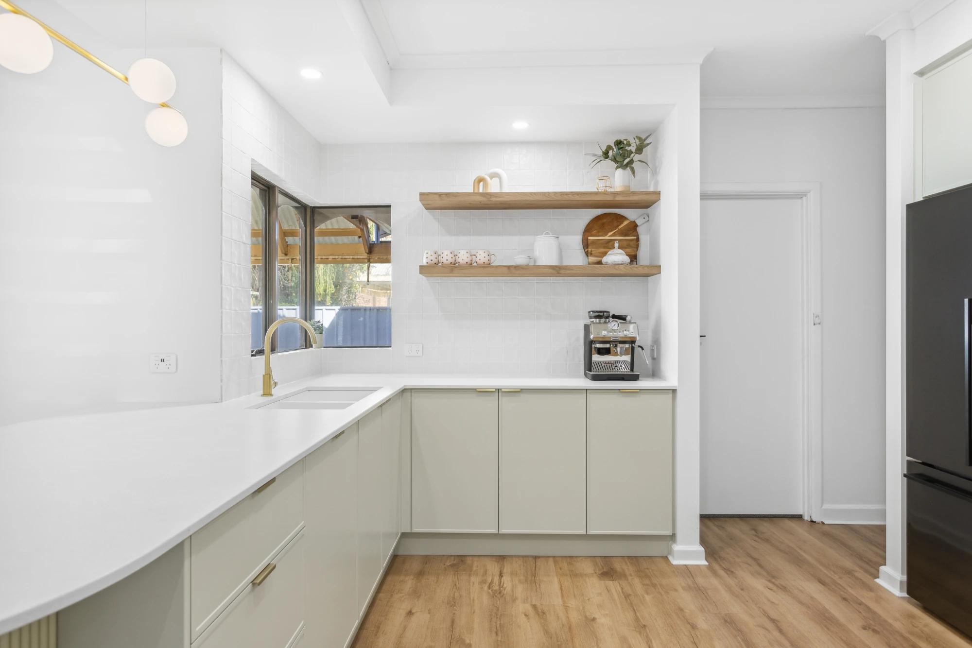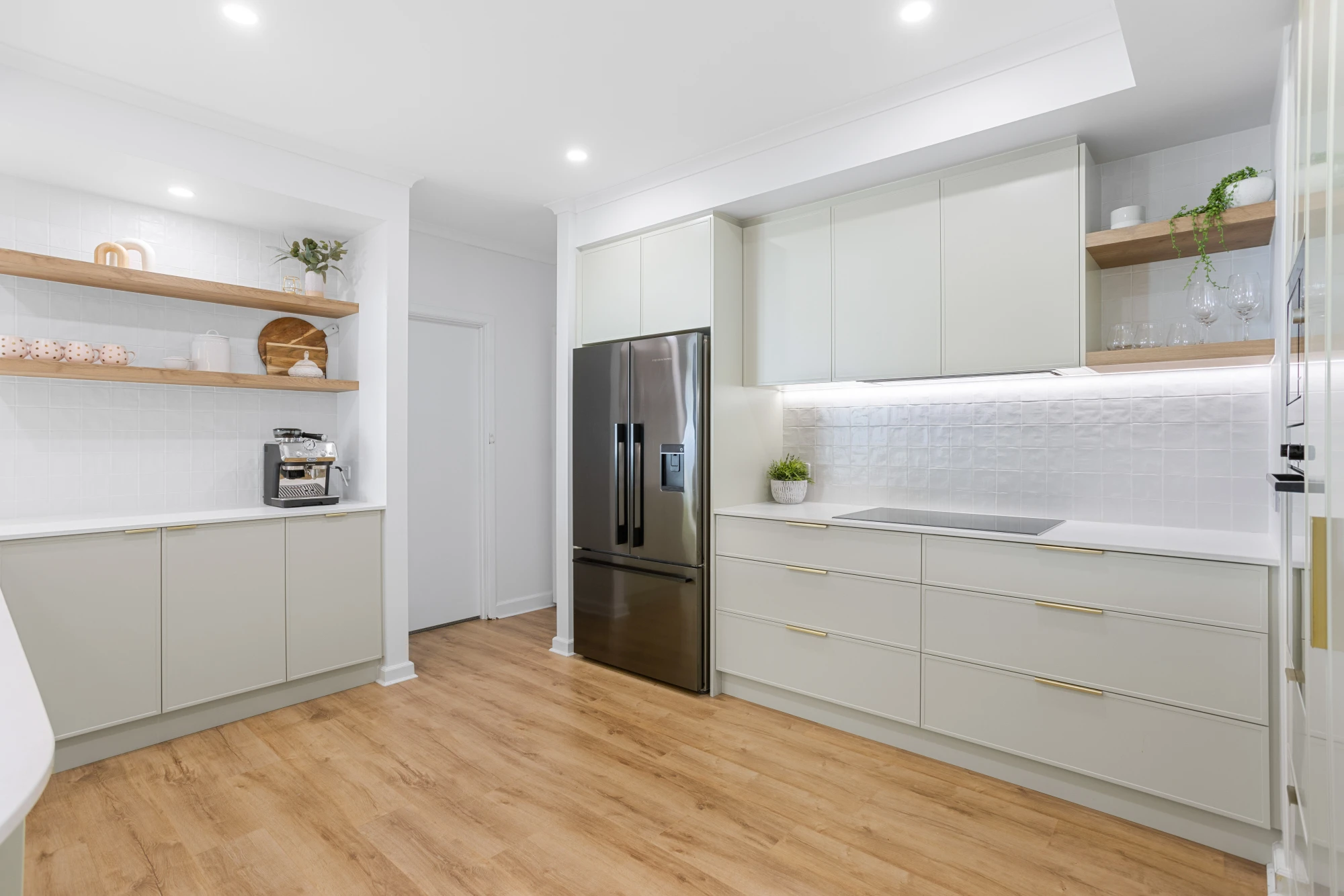 This kitchen also features a hidden walk in pantry, floating timber look shelves and a beautiful pendant light.