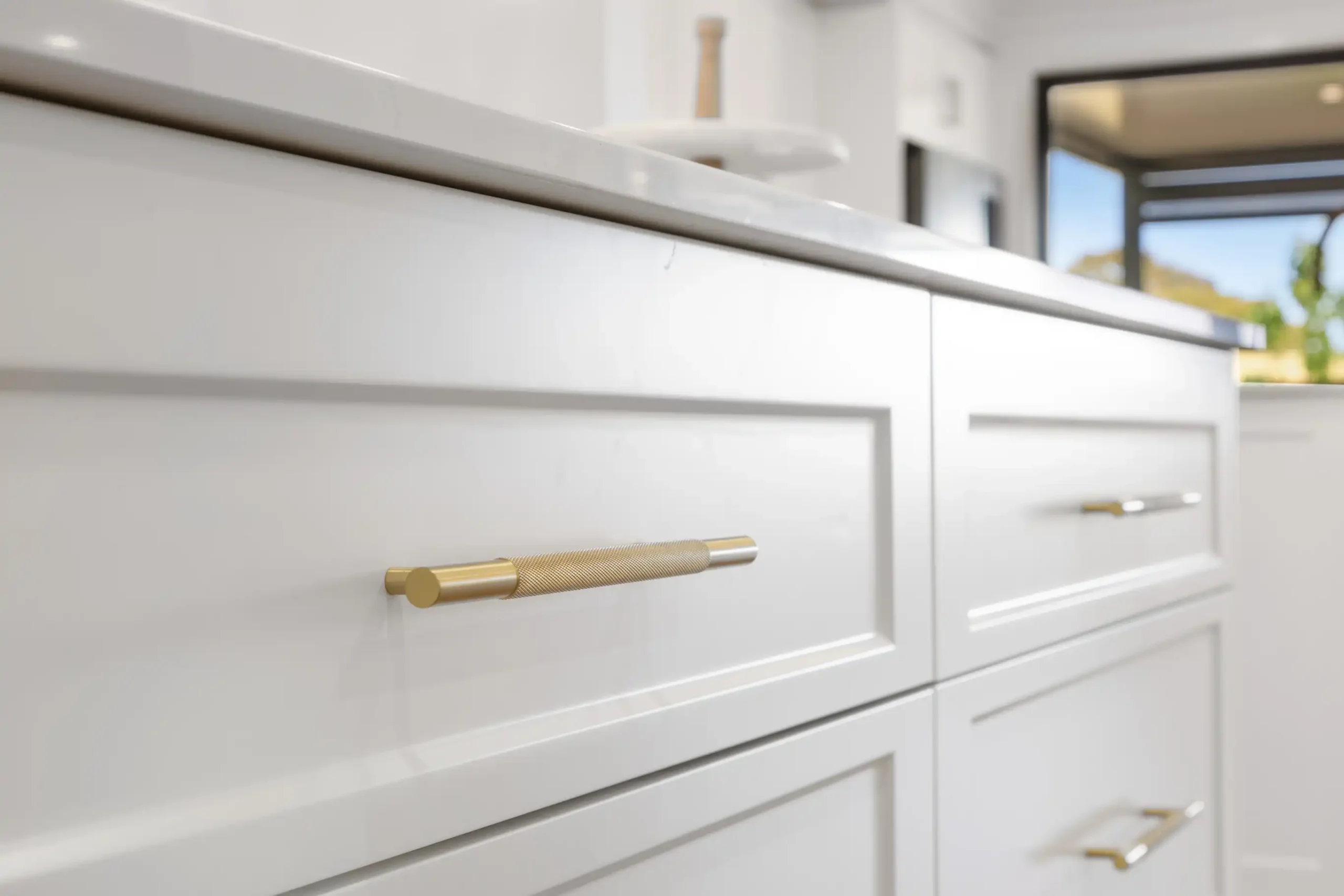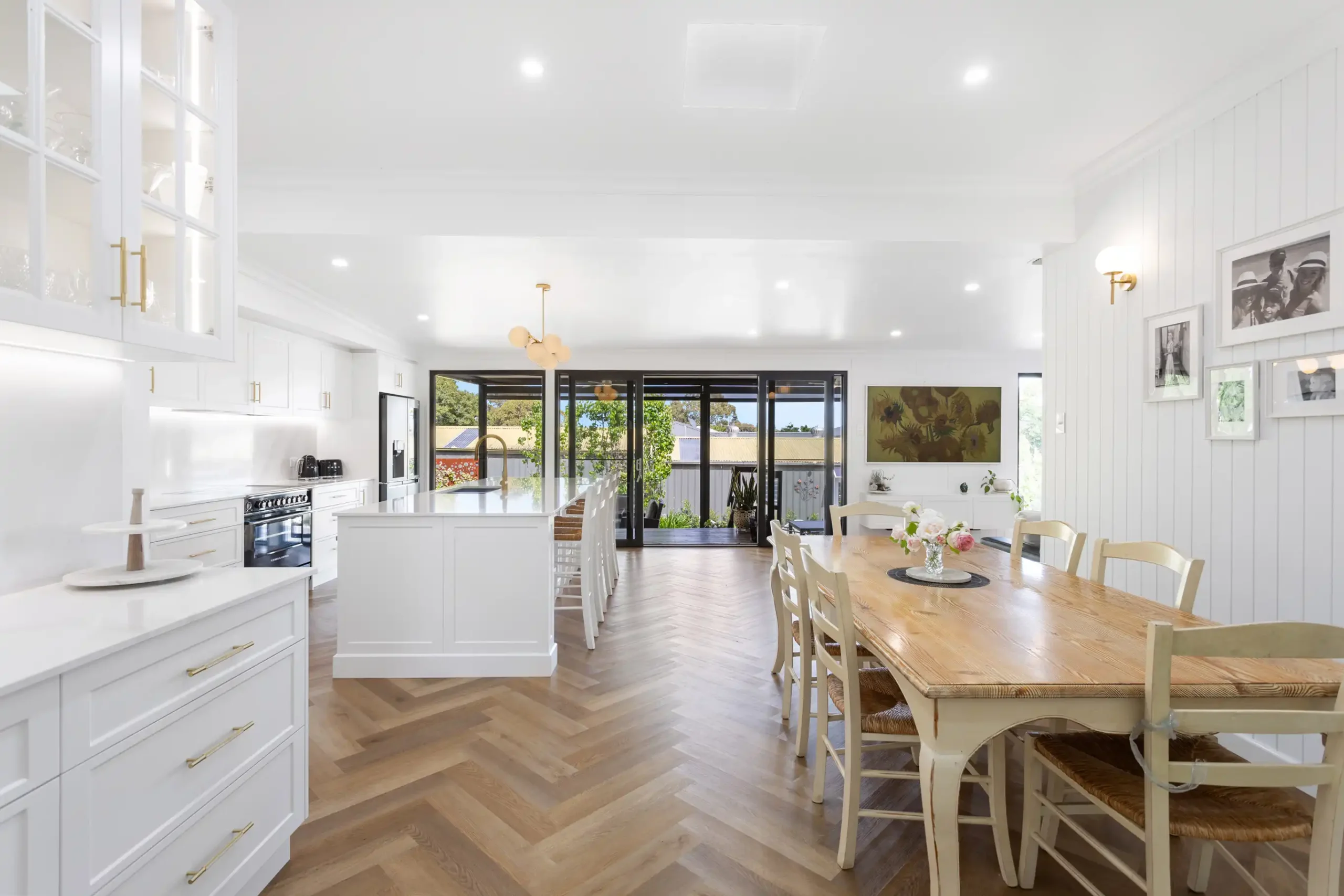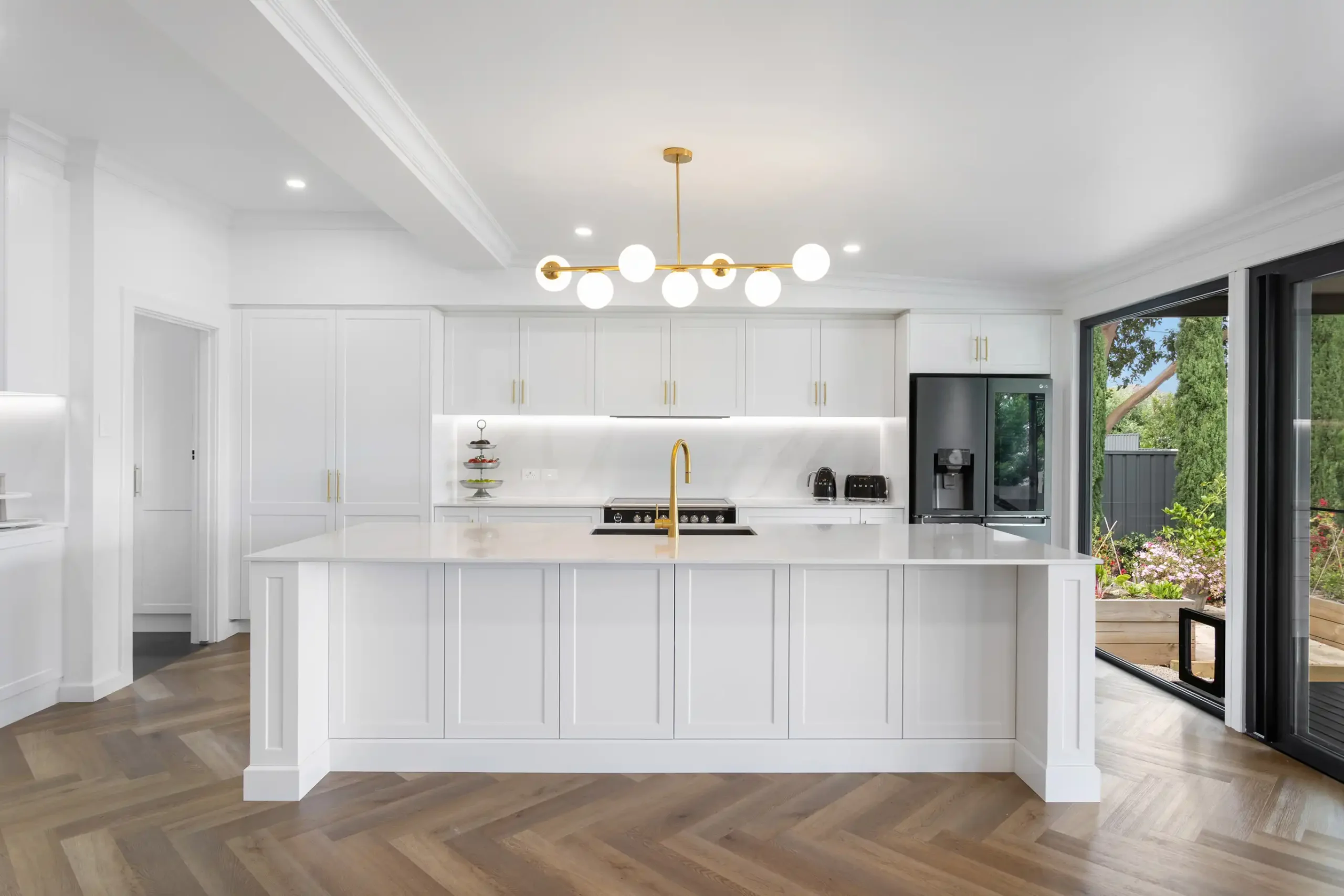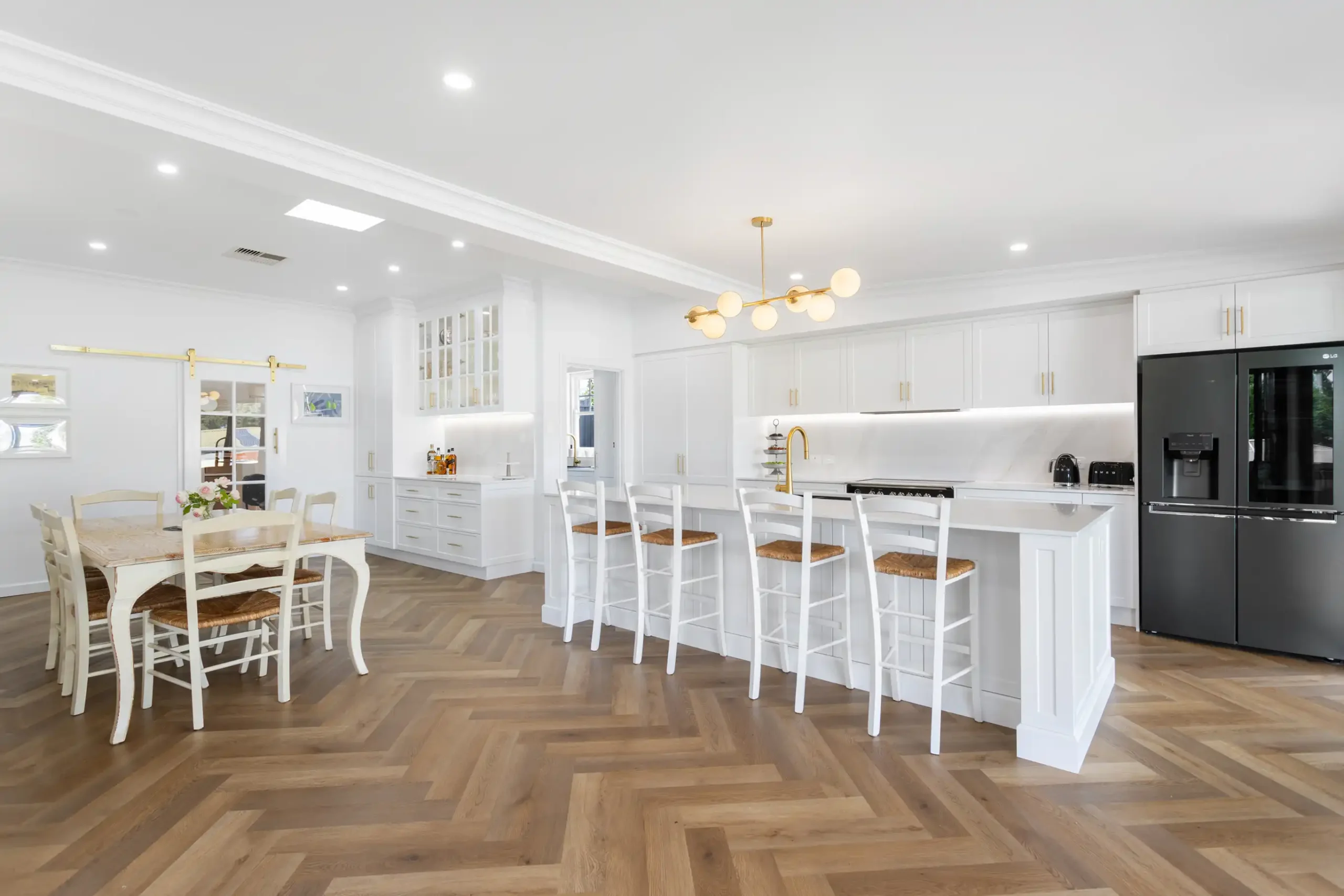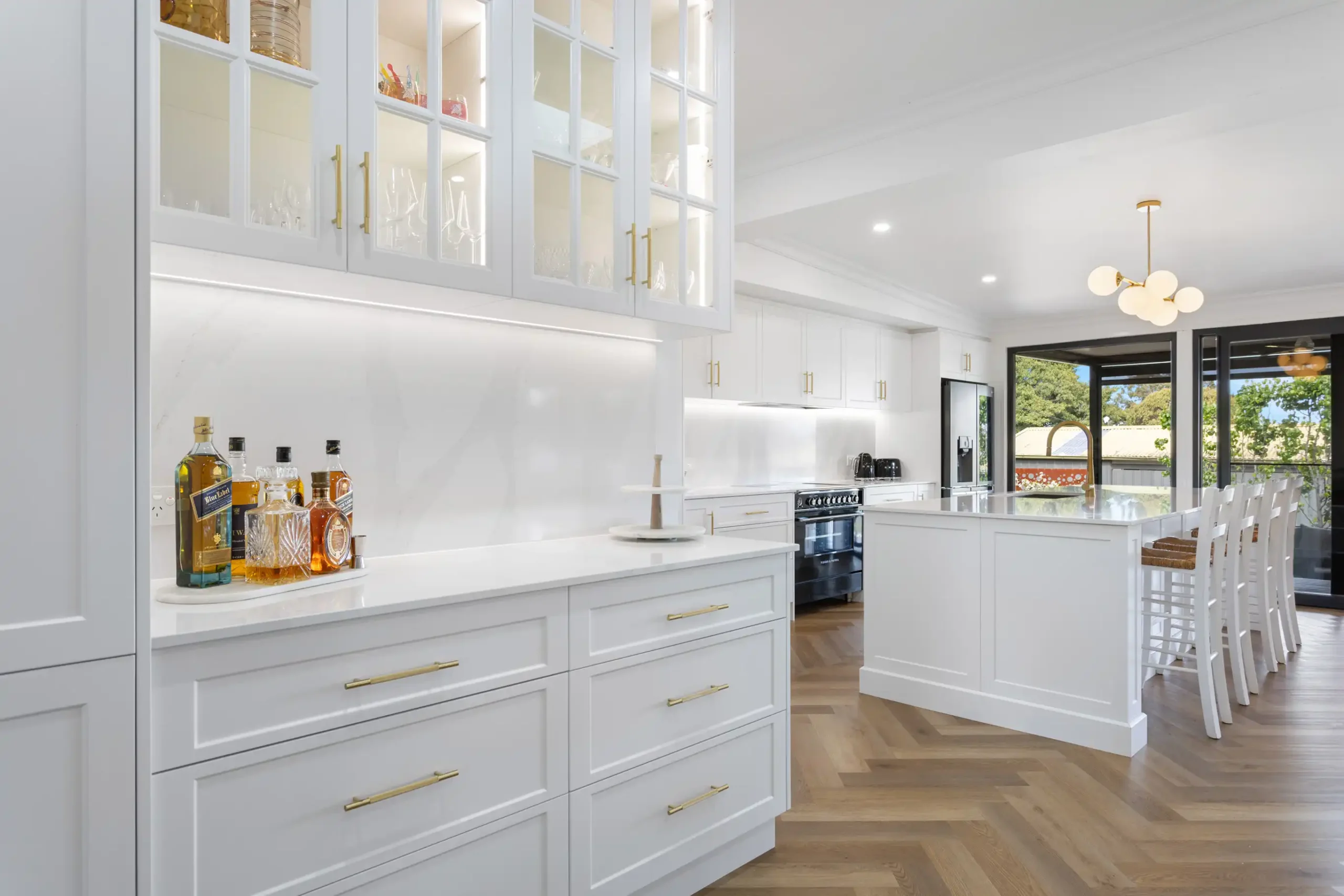 Designed for day to day living whilst being open and accessible for entertaining family and friends. This kitchen, buffet and laundry feature the popular Davis and Park Patricia door profile, 2 pack painted in Dulux, Lexicon Quarter, Satin Finish, set off with beautiful brass details, and stylish Silestone Callacutta Gold stone bench tops and splashbacks, hybrid floors laid in herringbone pattern.