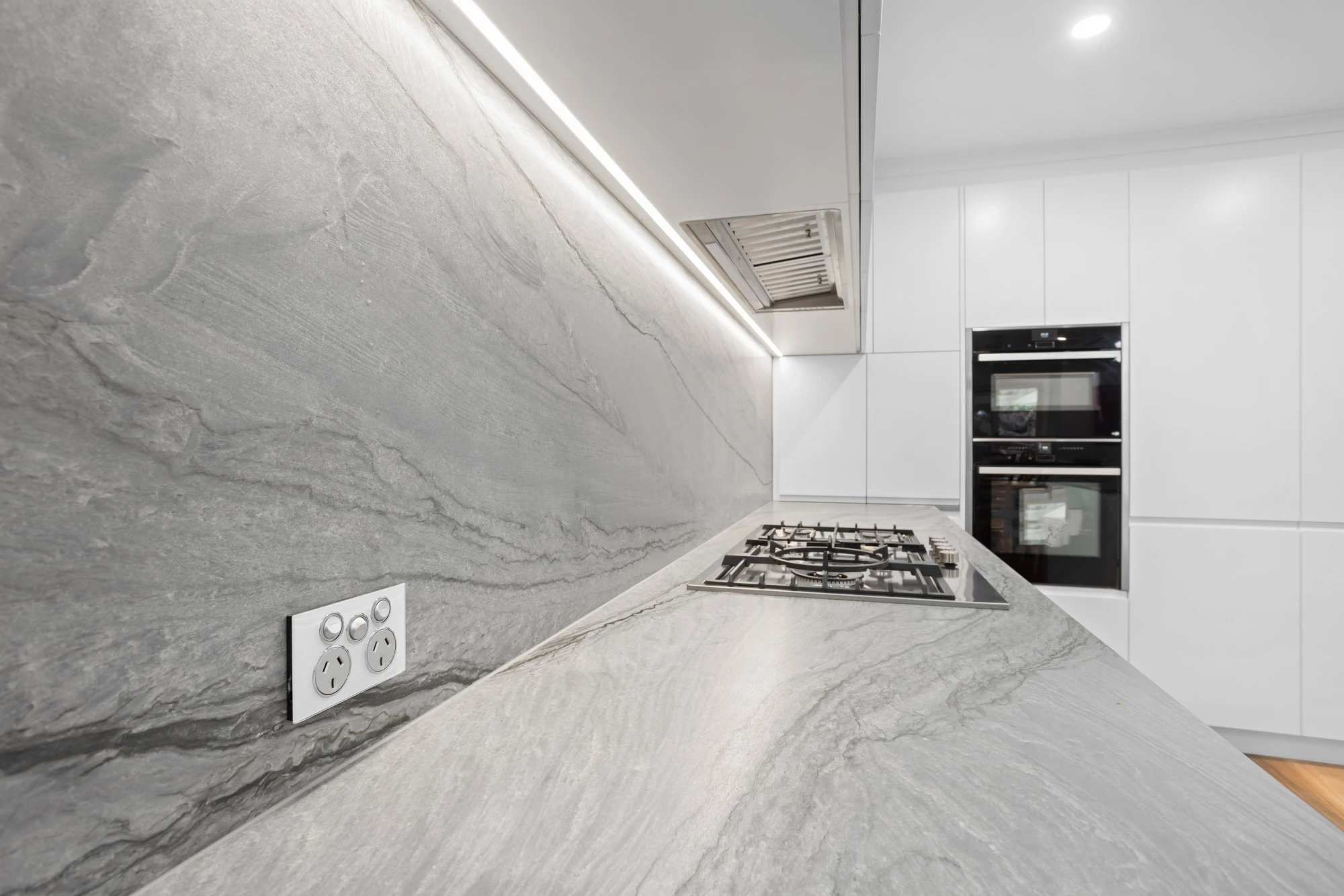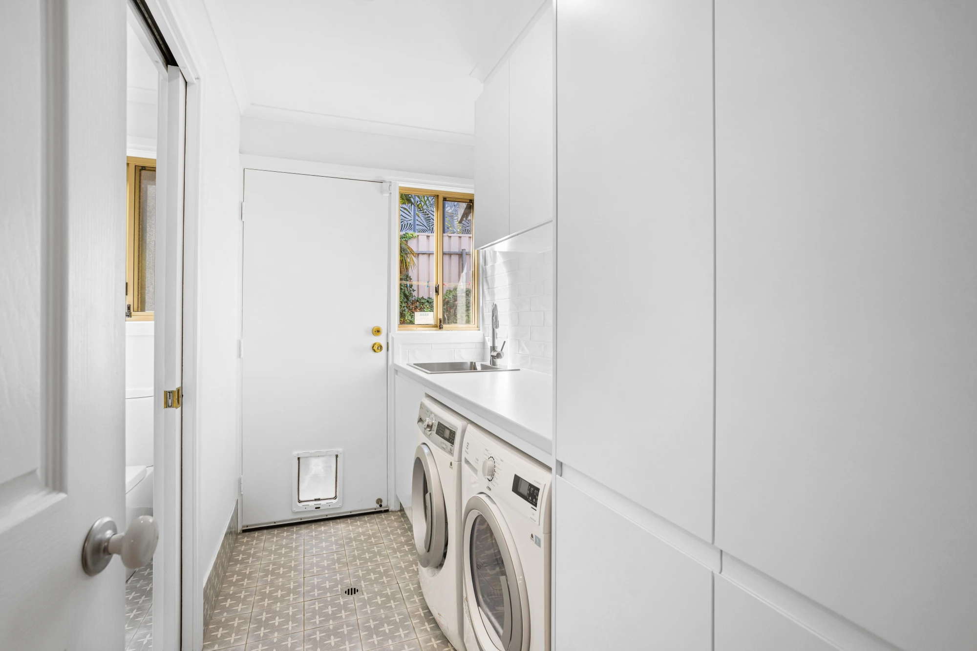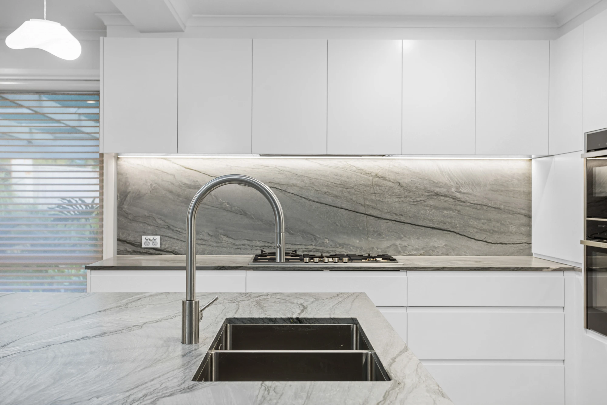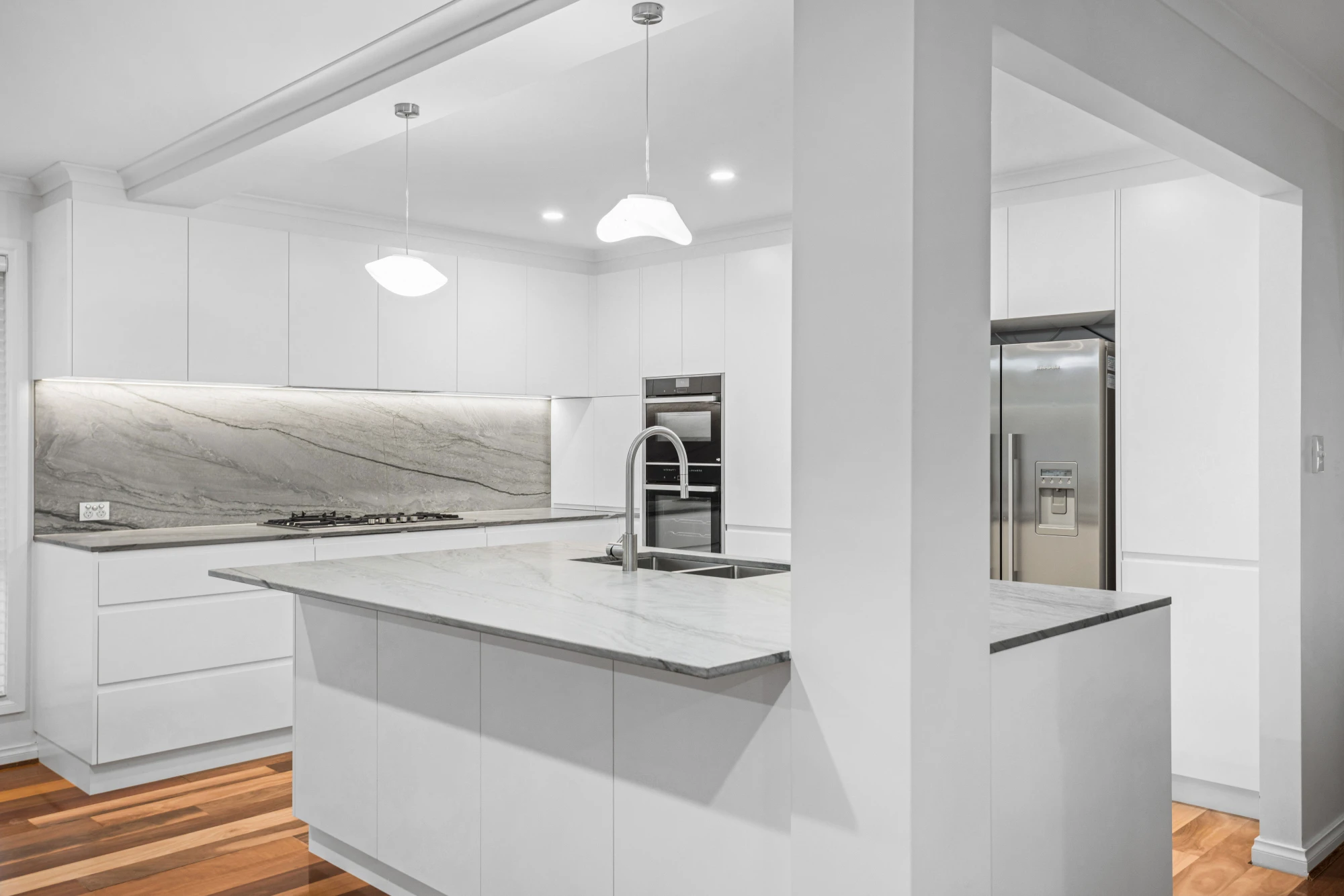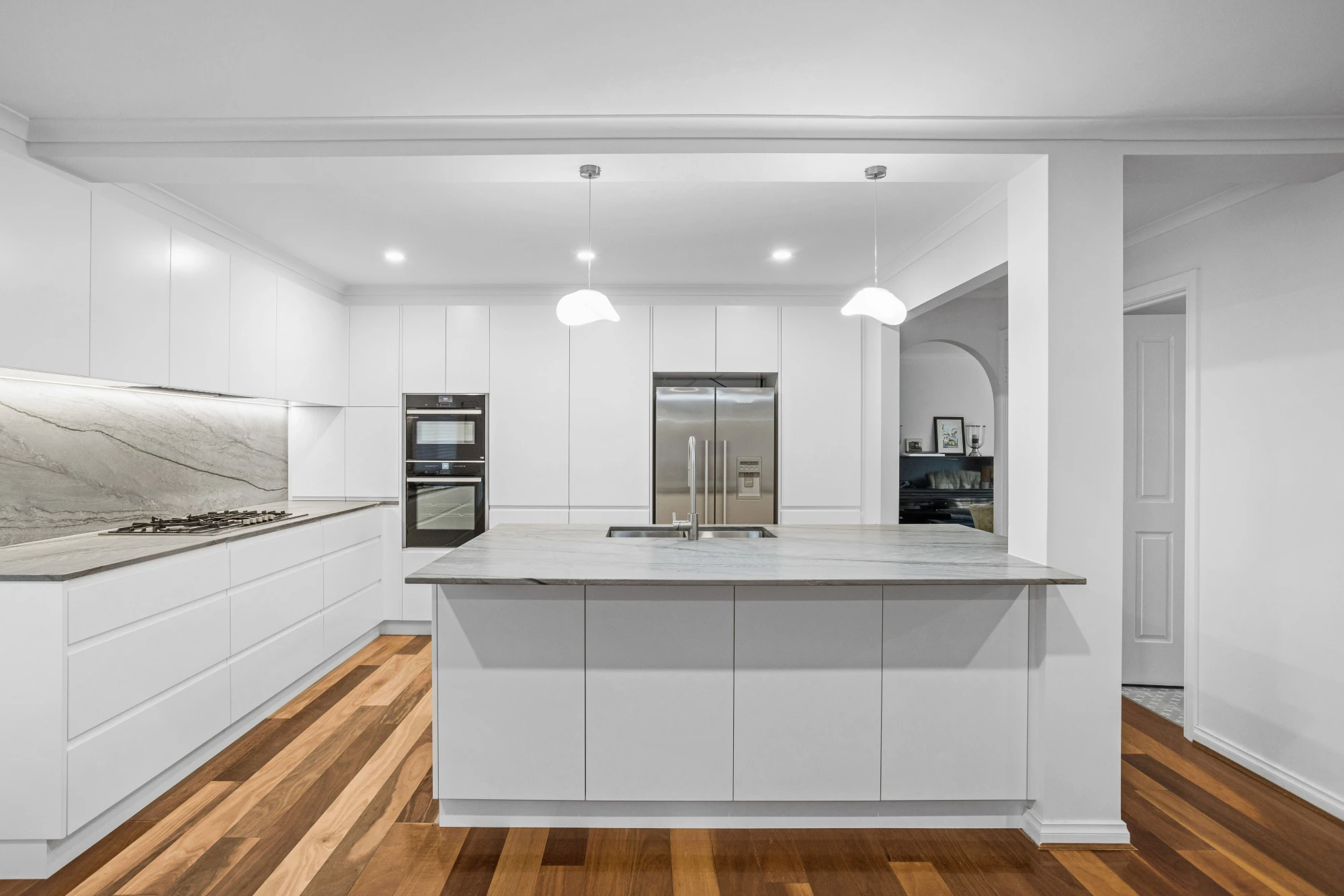 This modern new kitchen features Platino granite bench top and splash back, Emma Profile doors with integrated handles, designer led lighting, and useful accessories in nearly every cabinet. From the hidden appliance cabinet, to roll our pantry drawers, spice, utensil and cutlery trays, detergent pullout, hidden tea towel rails, generous hidden storage in the bar back as well as slide out cabinets on the island.