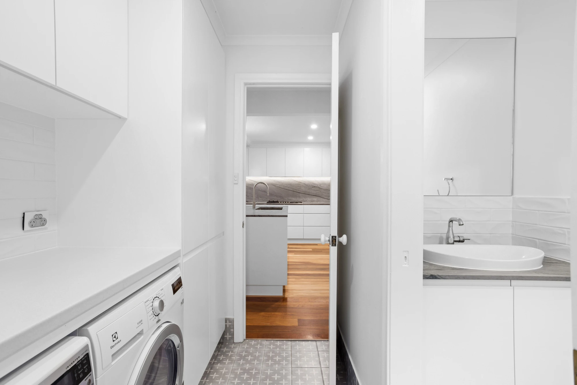 When the old kitchen went, we had our builder remove the unnecessary walls. Retaining the post due to support, but working with it to keep the post as integrated to the design as practical. The laundry and guest vanity floor and wall tiling was replaced and modernised.
