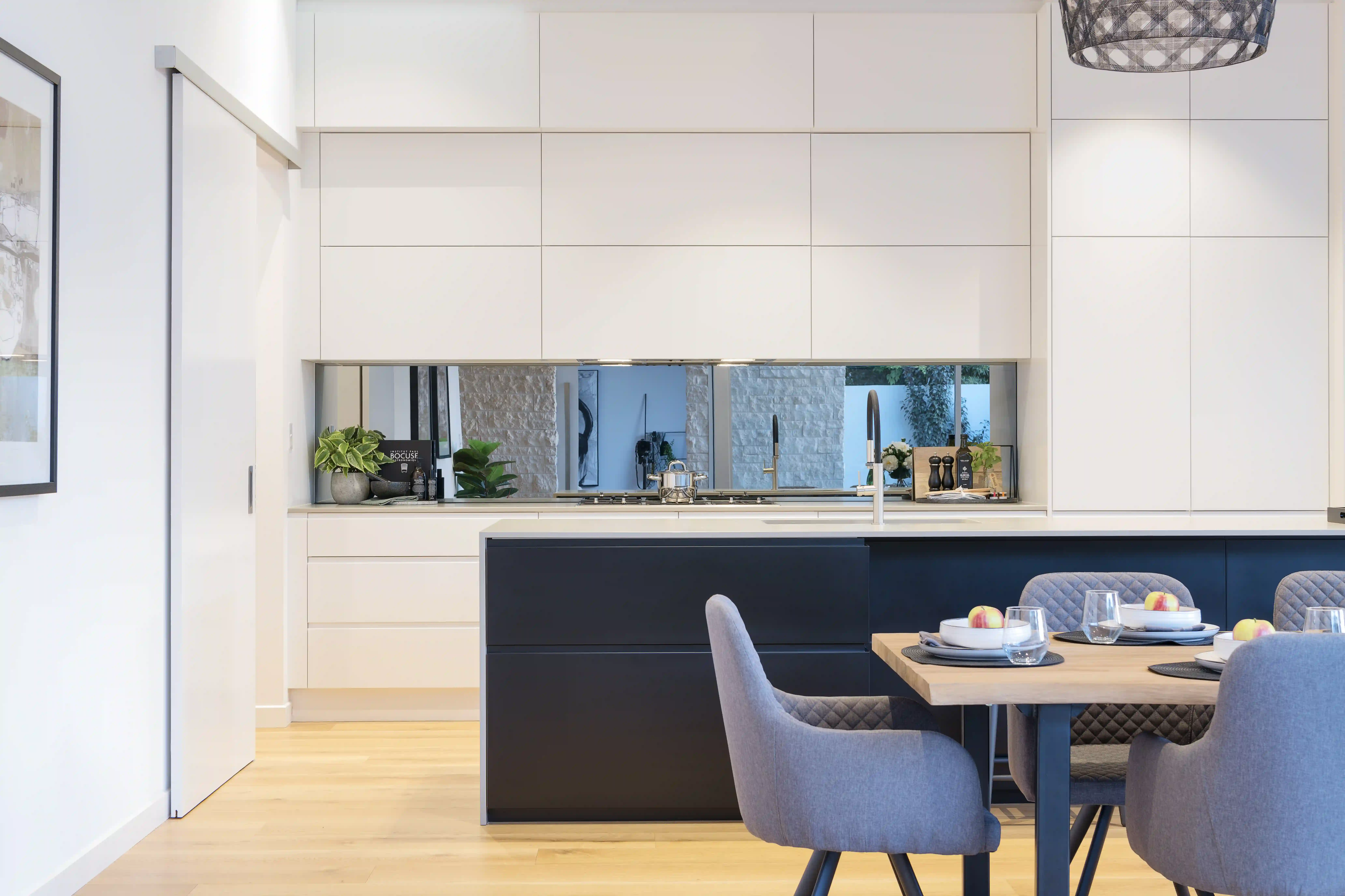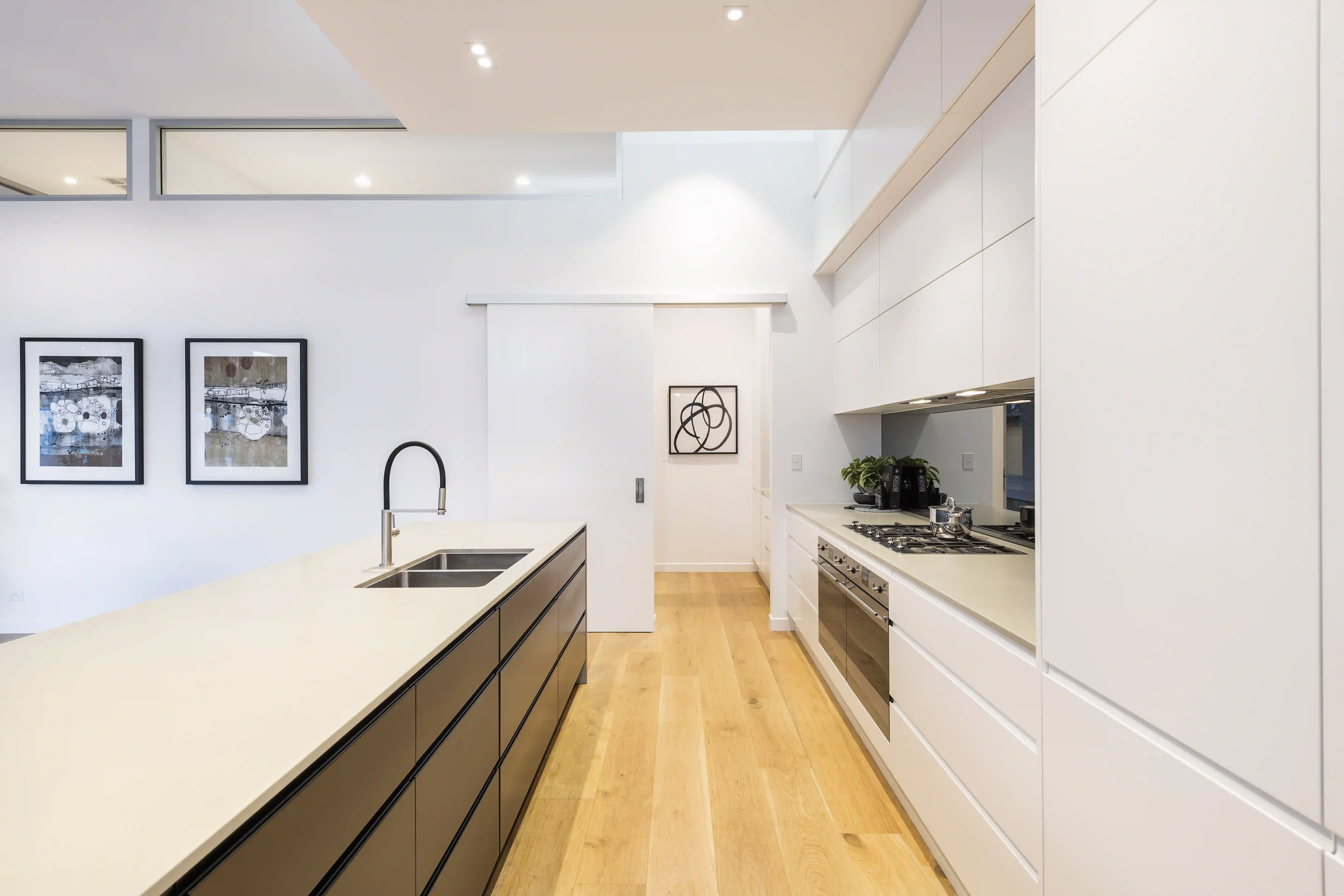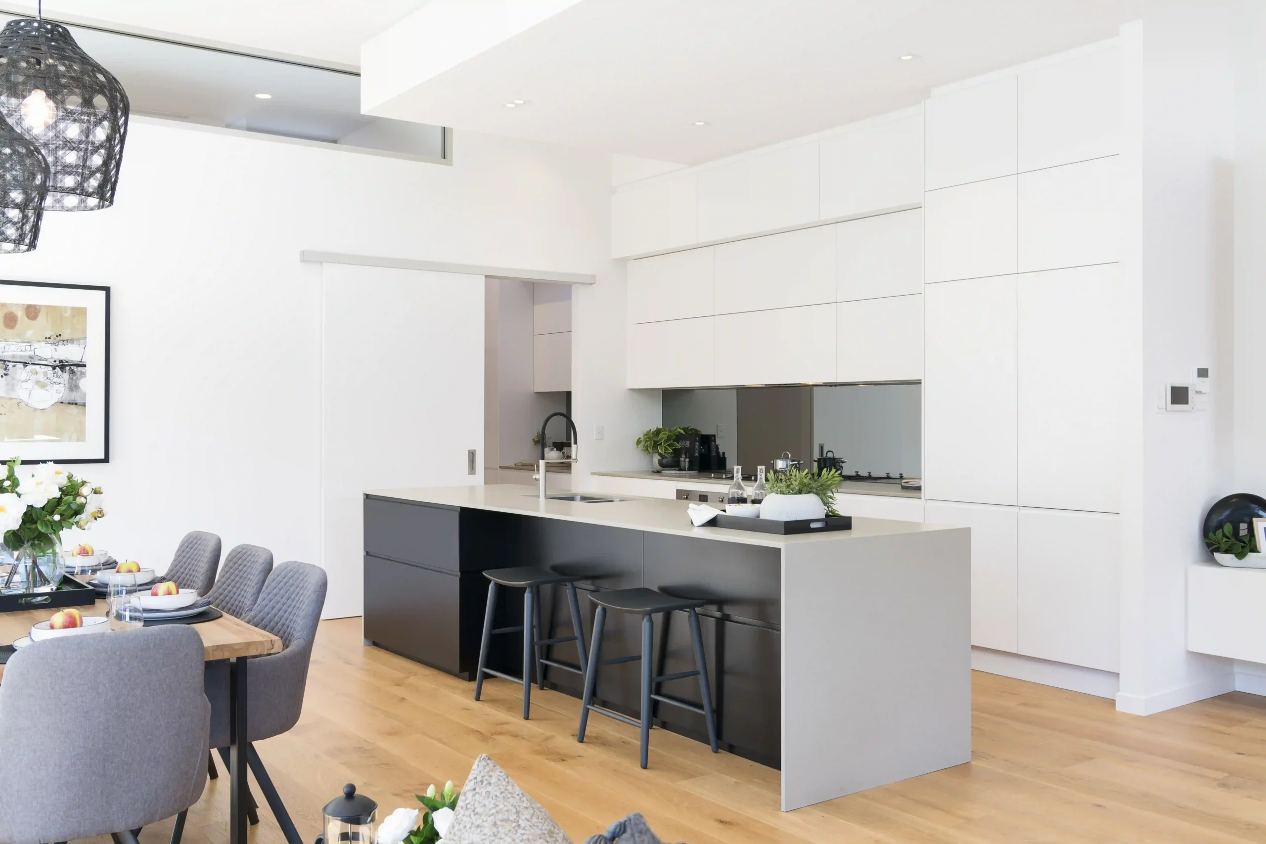All 2 pack custom cabinetry with stone benchtops and fully integrated appliances. Simple. Contrasting. Modern.