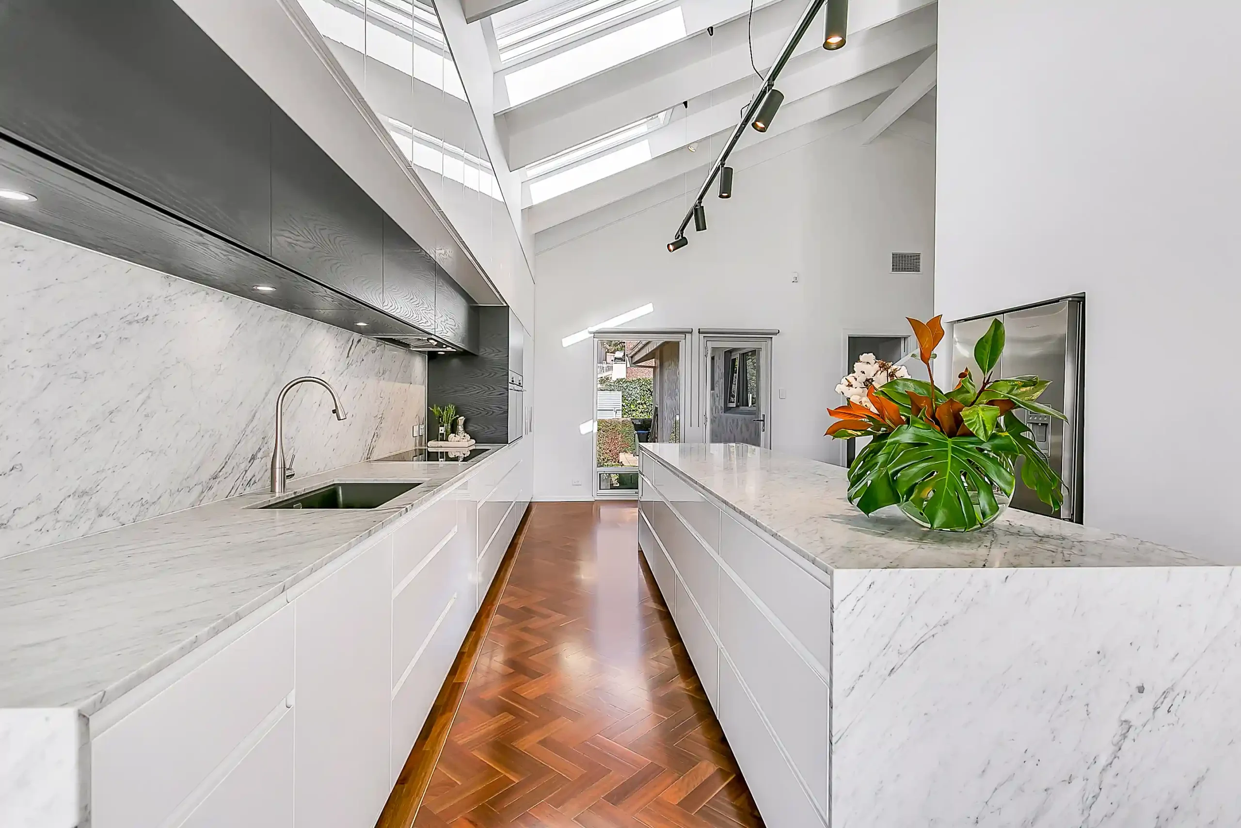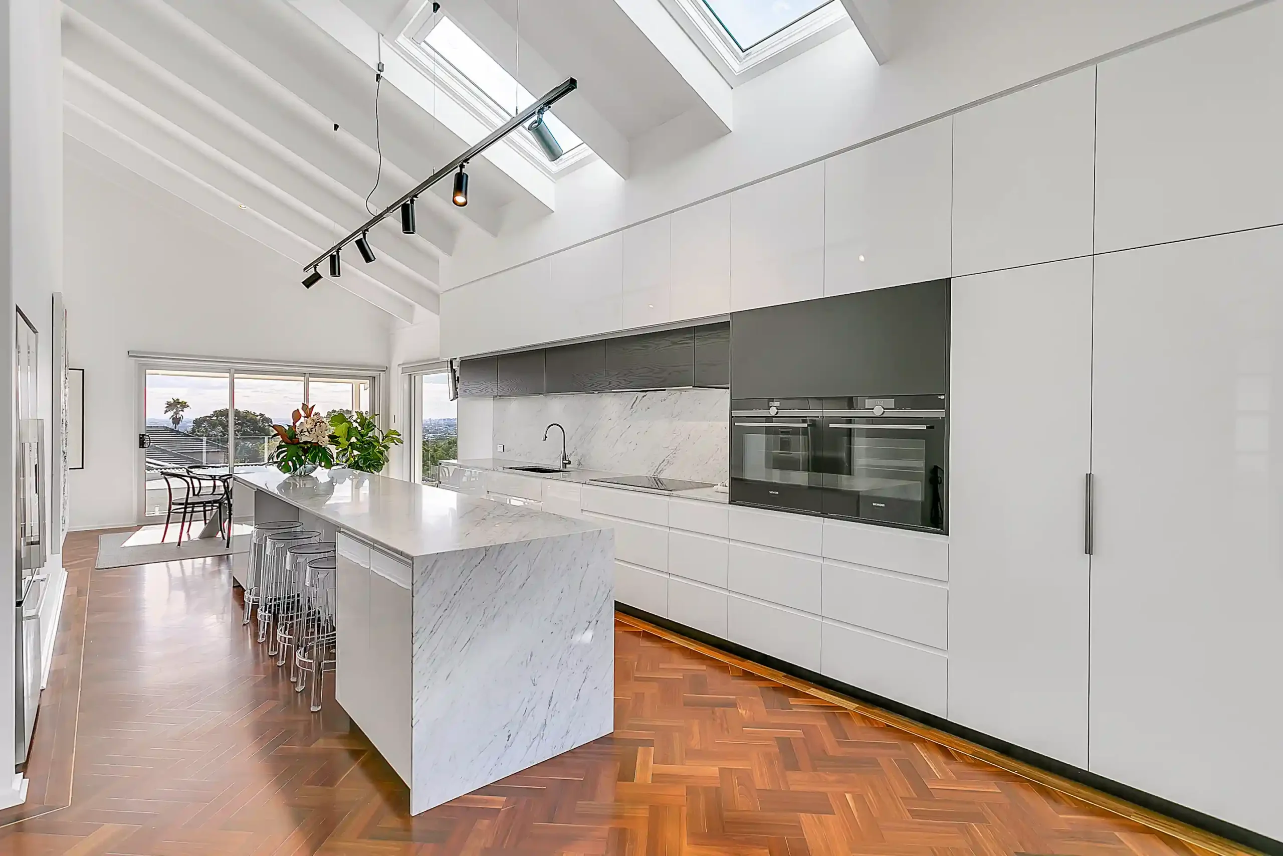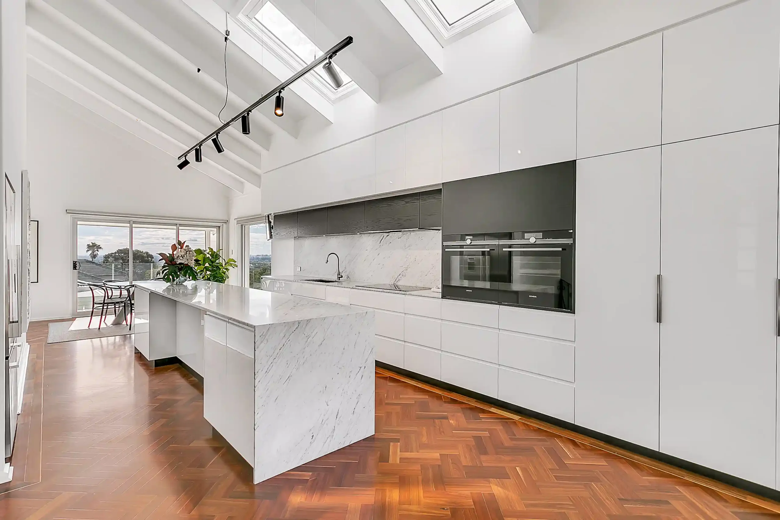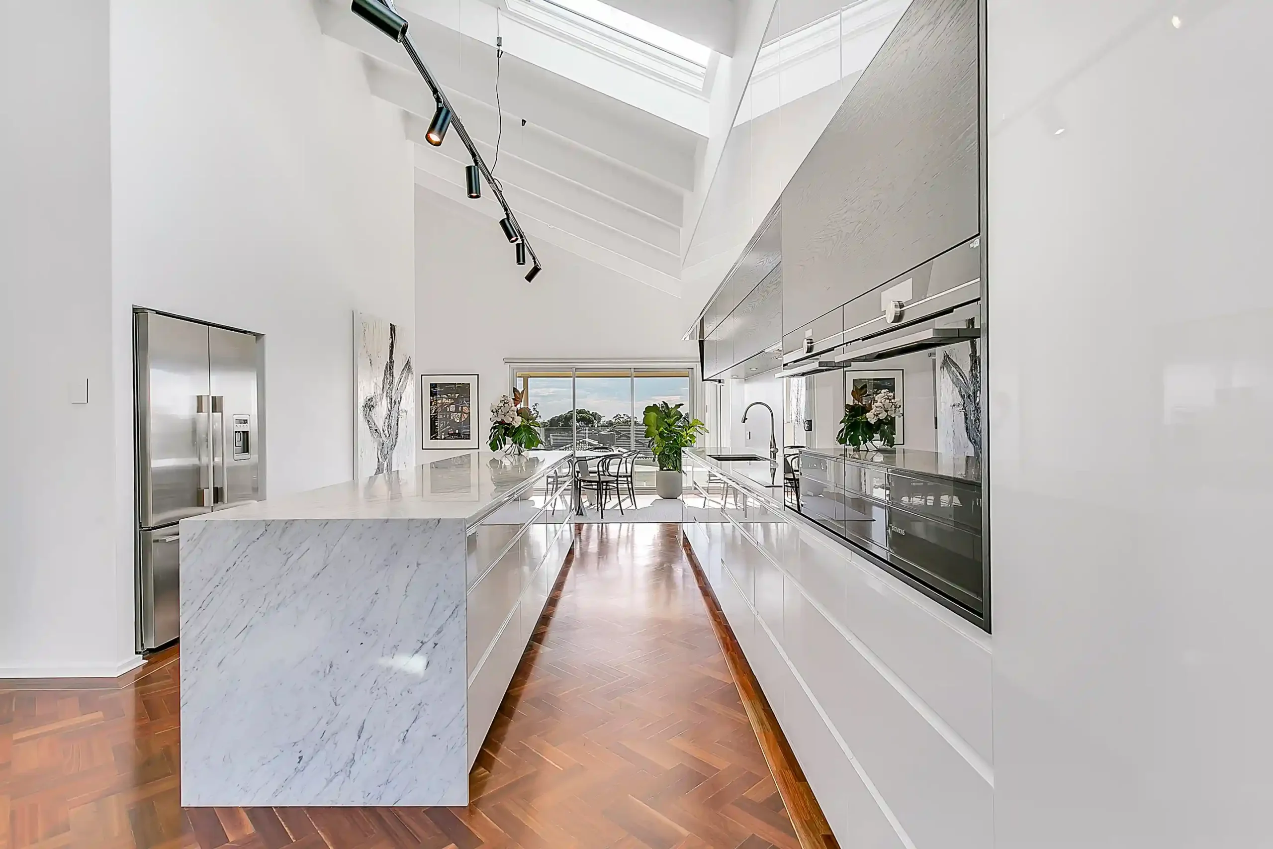 Appliances featured include a Fisher & Paykel integrated fridge, as well as a steam oven, pyrolytic oven, induction cooktop, built-in range hood, and built-in dishwasher.