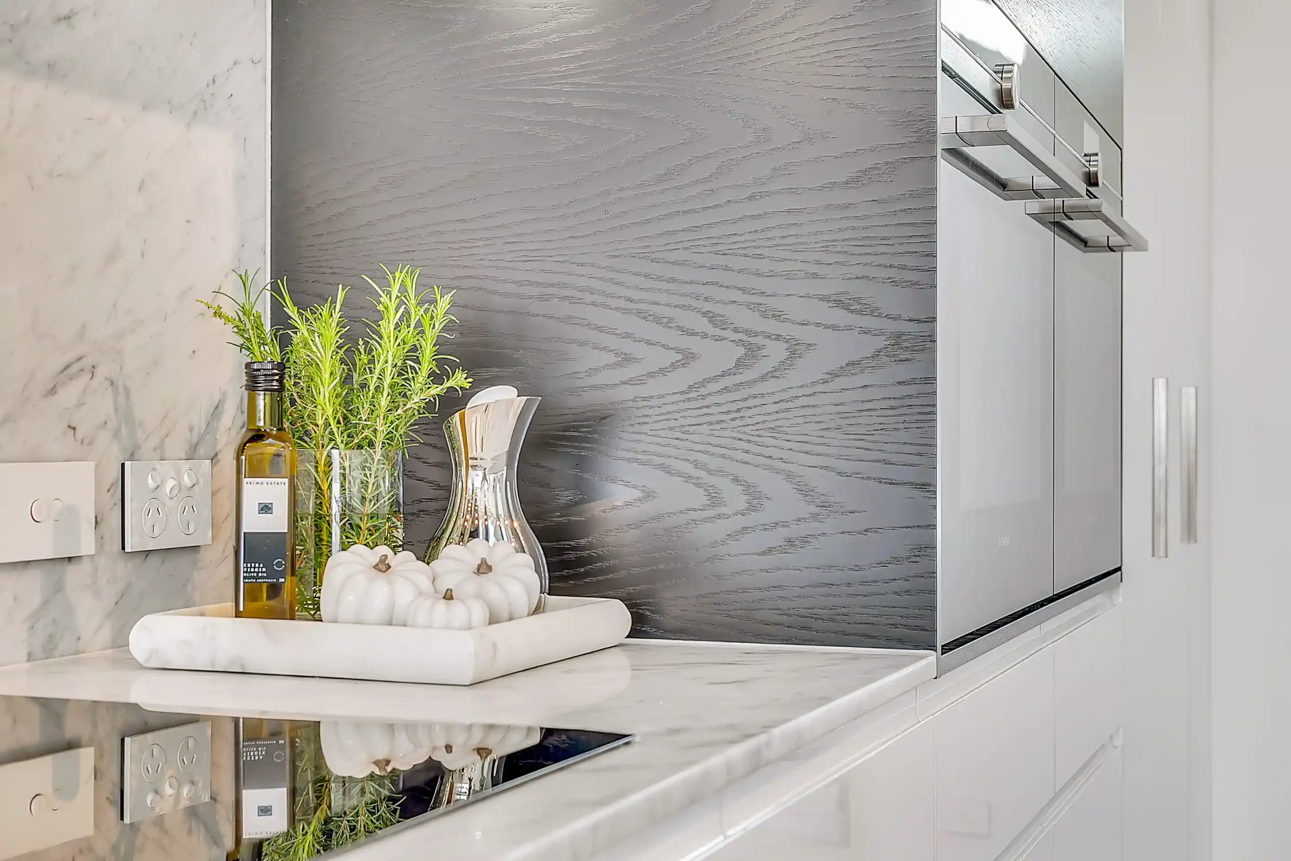 2 pack Emma gloss doors in Halo White, contrasted with feature American Oak cabinetry finished in a satin black two pack paint. Gorgeous! Then absolutely set off with Carrera marble benchtop and splashback.