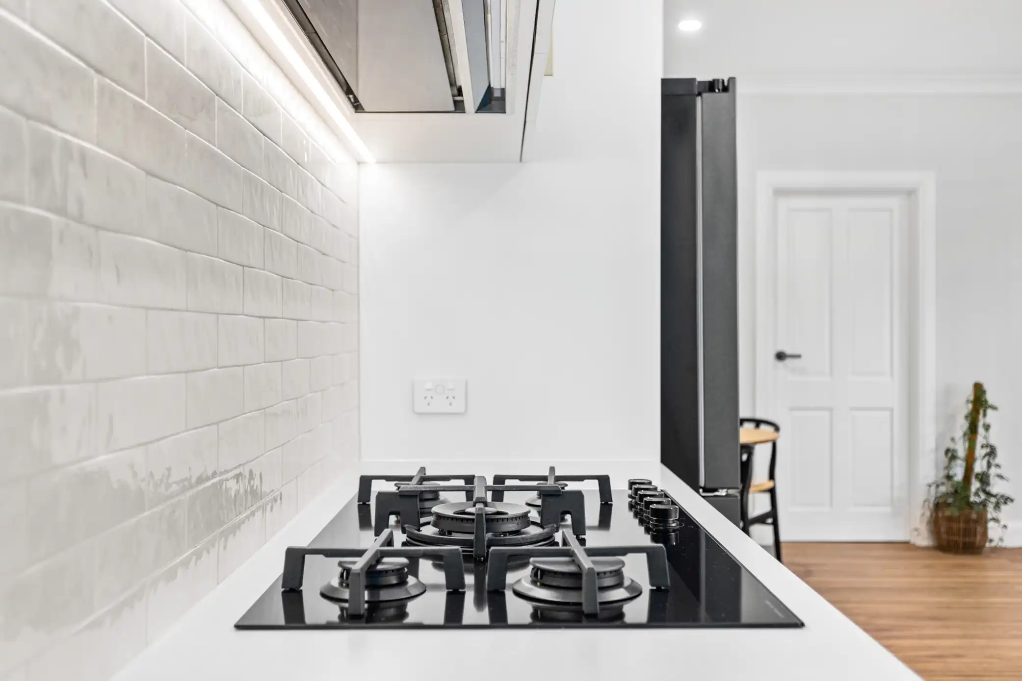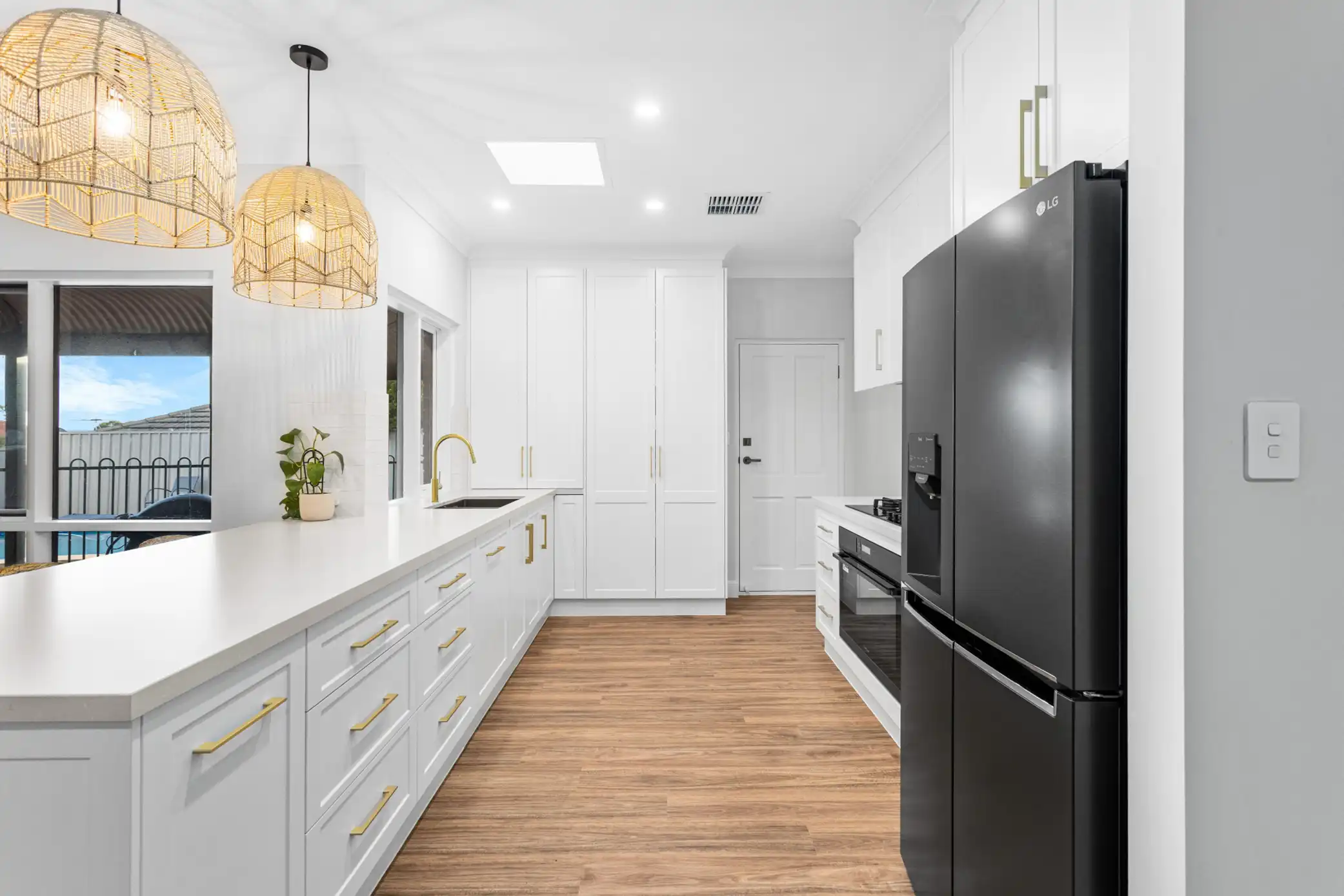 When the old kitchen went, we had our builder remove the unnecessary walls. Retaining the post due to support, but working with it to keep the post as integrated to the design as practical. The laundry and guest vanity floor and wall tiling was replaced and modernised.
