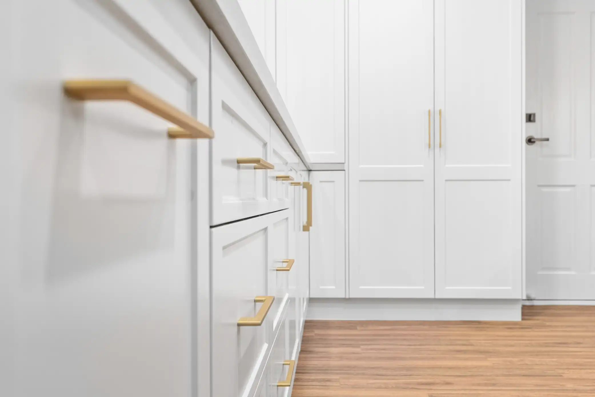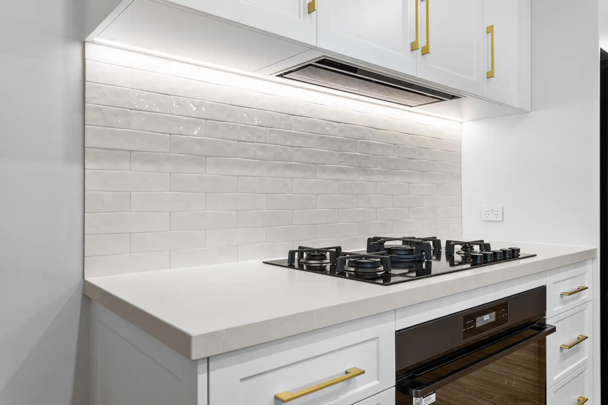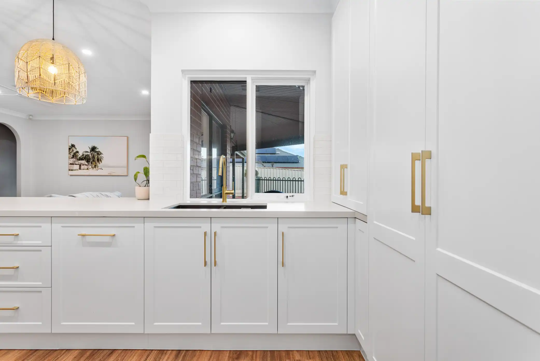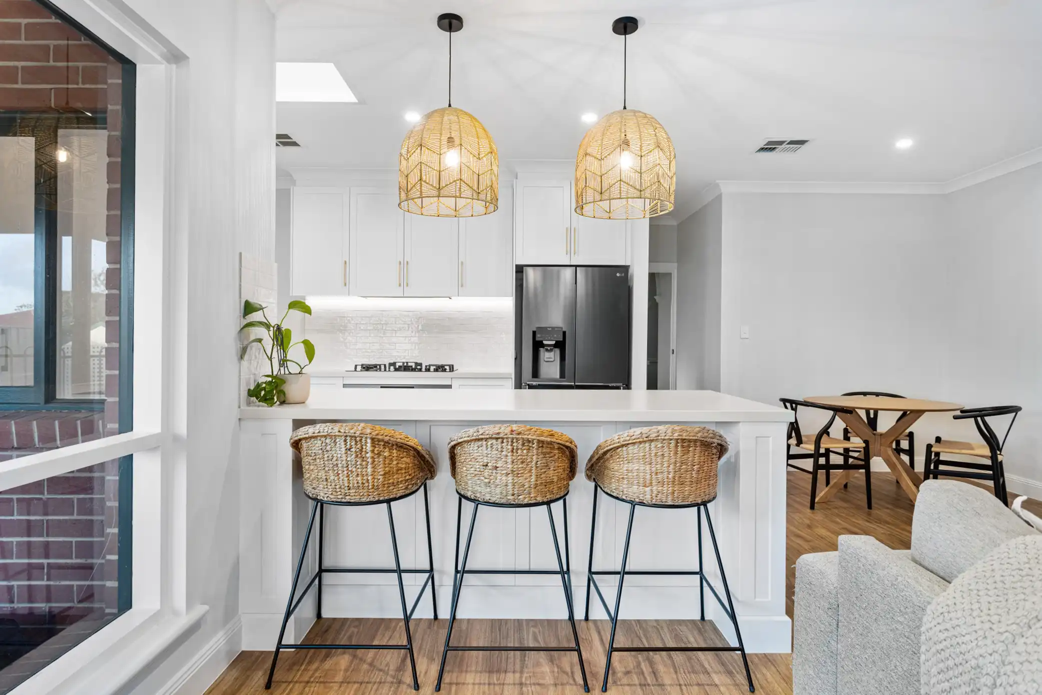 This modern new kitchen features Platino granite bench top and splash back, Emma Profile doors with integrated handles, designer led lighting, and useful accessories in nearly every cabinet. From the hidden appliance cabinet, to roll our pantry drawers, spice, utensil and cutlery trays, detergent pullout, hidden tea towel rails, generous hidden storage in the bar back as well as slide out cabinets on the island.
